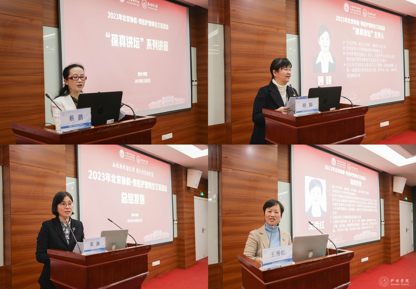 开讲仪式后,各位专家为YABO鸭脖师生带来了一系列精彩的讲座。吴欣娟教授作“助力全民健康 彰显护理价值”主旨讲座;李峥教授以“协和护理与贵医-卓越护理人才培养”为题作讲座;北京协和医学院YABO鸭脖副院长梁涛教授以“护理专业建设”为题作讲座;北京协和医学院YABO鸭脖社区护理学系主任郭爱敏教授作学系建设分享;北京协和医学院YABO鸭脖基础护理学系副主任张欣副教授结合国家级一流课程“基础护理学”的建设作经验分享;北京协和医学院护理实验中心副主任康晓凤教授介绍北京协和医学院YABO鸭脖护理技能中心建设经验。