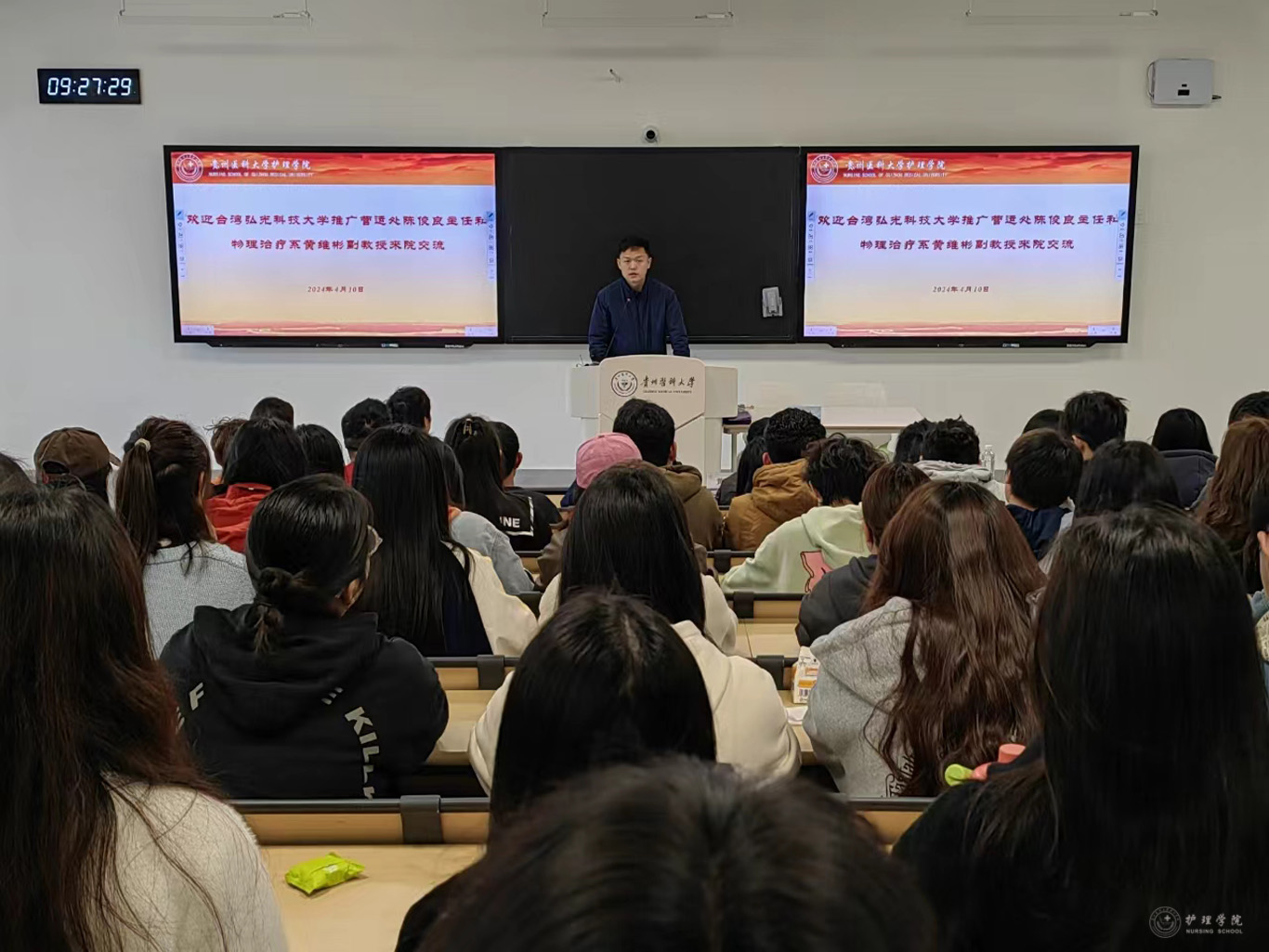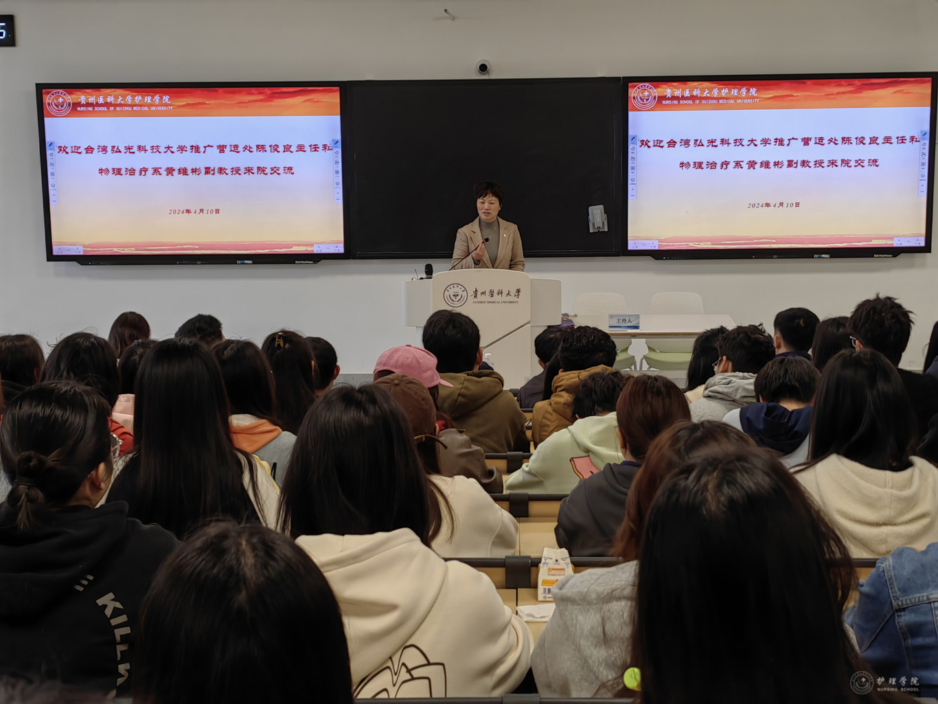 4月10日,台湾弘光科技大学推广营运处主任陈俊良及物理治疗系副教授黄维彬到鸭脖交流。YABO鸭脖党委副书记兼纪委书记何为、副院长王秀红、副处级组织员张黎、学校国际交流合作处港澳台事务管理科科长龙章波、YABO鸭脖相关专业教师及2023级本科生代表近120余人参加交流活动。交流活动由王秀红主持。