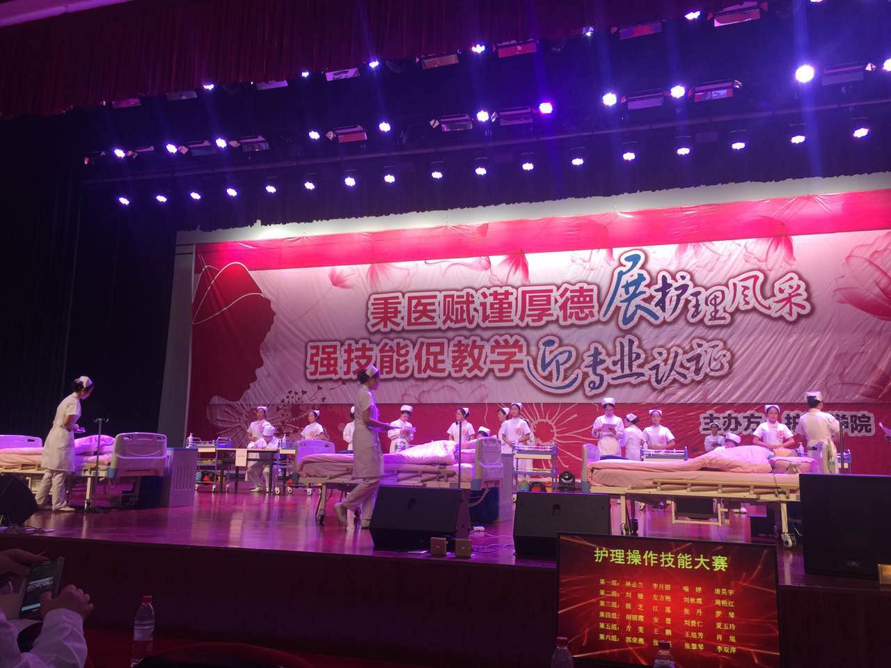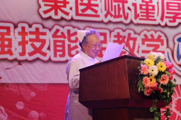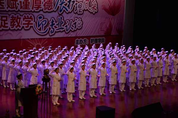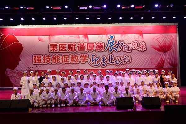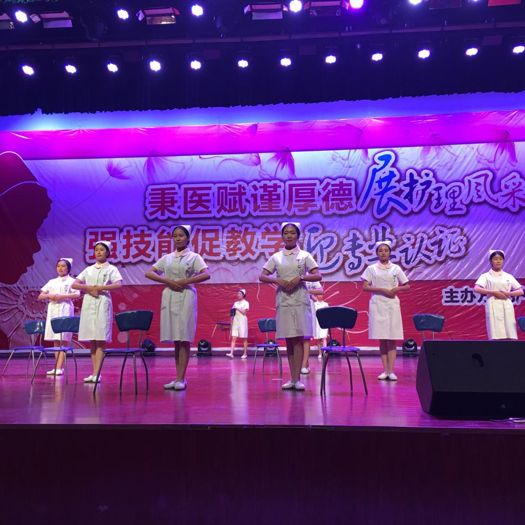 此次活动共分为授帽仪式、护理技能比赛、护理专业形象展示三部分。在嘹亮而柔美的护士之歌中,2015级新生纷纷戴上了洁白无瑕的燕尾帽,并在学院党委书记贾秀英的带领下宣读了庄严而神圣的护生誓词,同学们手捧蜡烛高唱护士之歌,歌声响彻了整个礼堂,唱出了即将作为一名护理人员的自豪。授帽仪式之后,便是精彩而又紧张的护理技能大赛,此次比赛首次采用案例多站式的形式开展,将理论与操作相结合,考察了学生皮内注射、心肺复苏及静脉输液三项护理操作技能,及以现场提问的形式考察学生的临场应变能力。六组参赛同学共24名,来自不同年级的选手以娴熟的操作,专业的态度,专注的神情打动了评委及在场的每一位观众。比赛结束后由常务副院长郭永洪作了点评,她表示:深深被同学们的表现感动,同时也为同学们在比赛中展现出来的团队合作精神而欣喜,并期望技能操作比赛能越办越好!活动最后,护理礼仪展示队伍向观众展示了护理人员在操作中的推、蹲、坐、站等姿态,举手投足间无一不展示了护理独特的礼仪风采和文化魅力。
