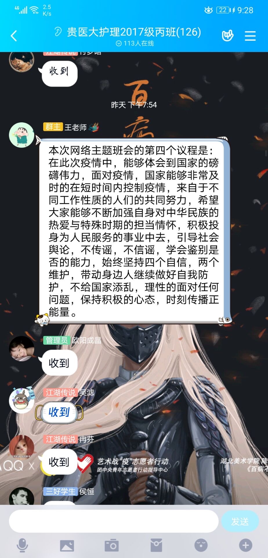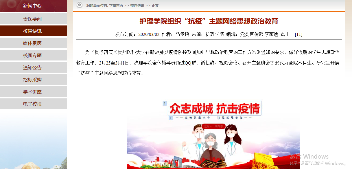 在学校和学院的领导和指导下,辅导员们立足本职工作,情系学生安危,充分利用互联网筑起与学生之间保持信息畅通的桥梁,及时为学生送去温暖:排查并重点关注湖北籍、有湖北旅居史学生;每日组织学生通过“今日校园”APP打卡的方式了解学生现居地和身体健康状况;对疫情严重地区学生进行心理辅导;上报疫情期间学生相关数据;协调毕业生实习就业相关事宜;召开网络视频班会传达学校的教学和管理规定、进行网络思想政治教育;心系毕业生就业工作,制作毕业生就业宣传推文,召开毕业生实习管理暨就业指导主题班会;积极组织撰写宣传、科普推文,通过“贵医护院”微信公众号普及新型冠状病毒肺炎防控知识,全方位引导学生正确对待疫情,做到不信谣、不传谣、自觉居家;学院团委积极组织开辟“贵医护理校友抗疫先进事迹”系列报道及 “南丁格尔志愿者抗疫行动”系列报道,宣传YABO鸭脖师生及校友抗疫事迹,传递正能量,帮助在校生正确认识护理专业,提升专业认同感的同时增加专业自豪感,树立投身医疗事业,为人民服务的远大志向。