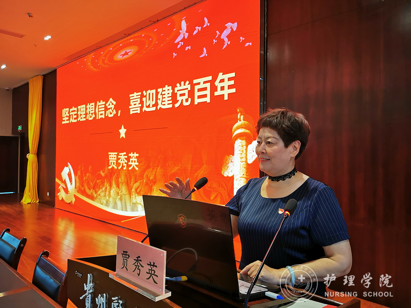 贾秀英,坚守在教书育人工作岗位上42年。她勇于担当,勇于奉献,关爱学生。她说党员在关键时刻要站出来,冲得上去,要坚定理想信念,培养吃苦耐劳精神。时代造就英雄,伟大来自平凡,贾秀英用她一生坚守岗位的事迹向我们讲述了她的入党故事:一直以来她都非常严格要求自己,积极参加学校组织的活动;非典期间坚持每天都到学生寝室同学生进行交流,做心理疏导;当时,繁重的工作压力引发了高血压,她甚至脚软得站不起来但依旧坚守岗位。儿子高考之际,她不顾亲朋好友反对,主动报名下乡去党建扶贫,为村民修路、疏通沟渠以及帮助白内障贫困家庭组织捐款建房;退休之际,她依旧全力以赴把护理学本科专业认证的工作落实好,贾秀英一生为党奉献终身的坚定理想信念鼓舞了全体师生,台下掌声雷动。