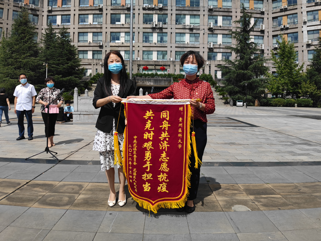 增援核酸采样辅助工作期间,师生们每天不畏艰苦、坚守岗位,科学、高效、细致、安全地完成了上级布置的各项工作任务,获得了各增援点党委、政府和居民的一致好评,收到了中共花溪区委员会、花溪区人民政府赠送的“同舟共济志愿抗疫,共克时艰勇于担当”锦旗。