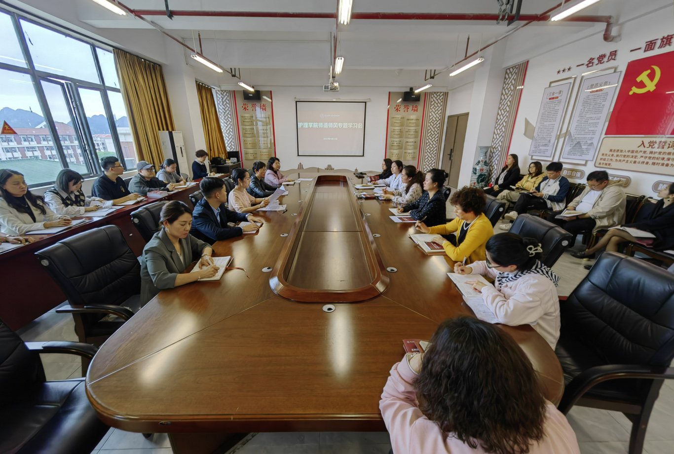4月22日,为进一步加强师德师风建设,规范教师职业行为,提升教师思想政治素质和职业道德水平,YABO鸭脖在云漫湖校区酬勤楼六楼会议室召开师德师风专题学习会。会议由学院党委书记杨英主持,全院教职工参会。