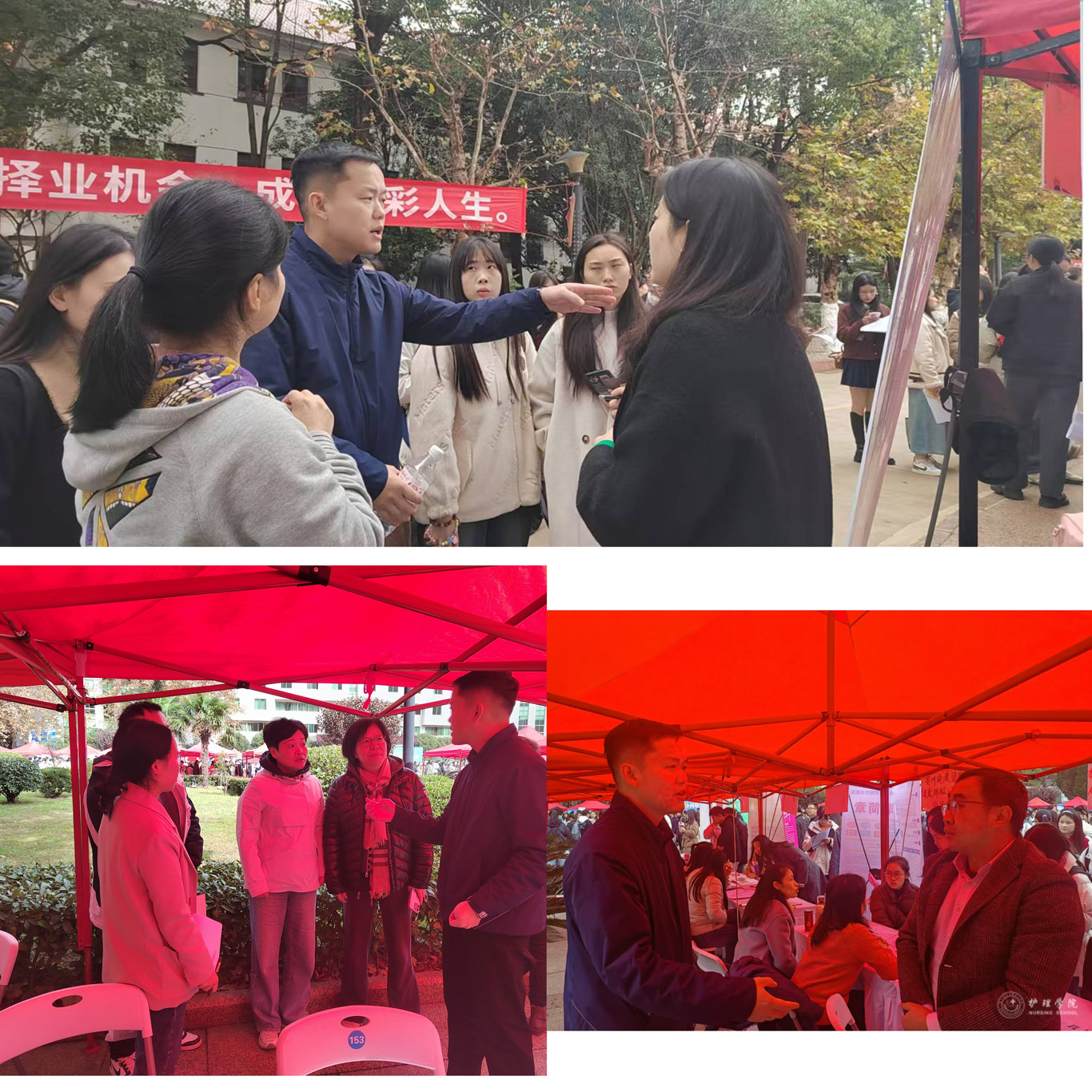 招聘会现场,同学们穿着得体大方,带上自己精心准备的简历应聘心仪岗位。招聘会现场,学院党委书记杨英对学生进行一对一就业指导,叮嘱同学们要学会主动分析研判当前的就业形势,敢于竞争、善于竞争,在就业市场中抢占先机,稳就业、稳择业。期间,学院党委副书记兼纪委书记何为积极与招聘护理学、助产学的四十余家用人单位现场沟通,精准推送鸭脖优秀毕业生。此次招聘会效果良好,同学们在老师们的指导下精准投递简历。