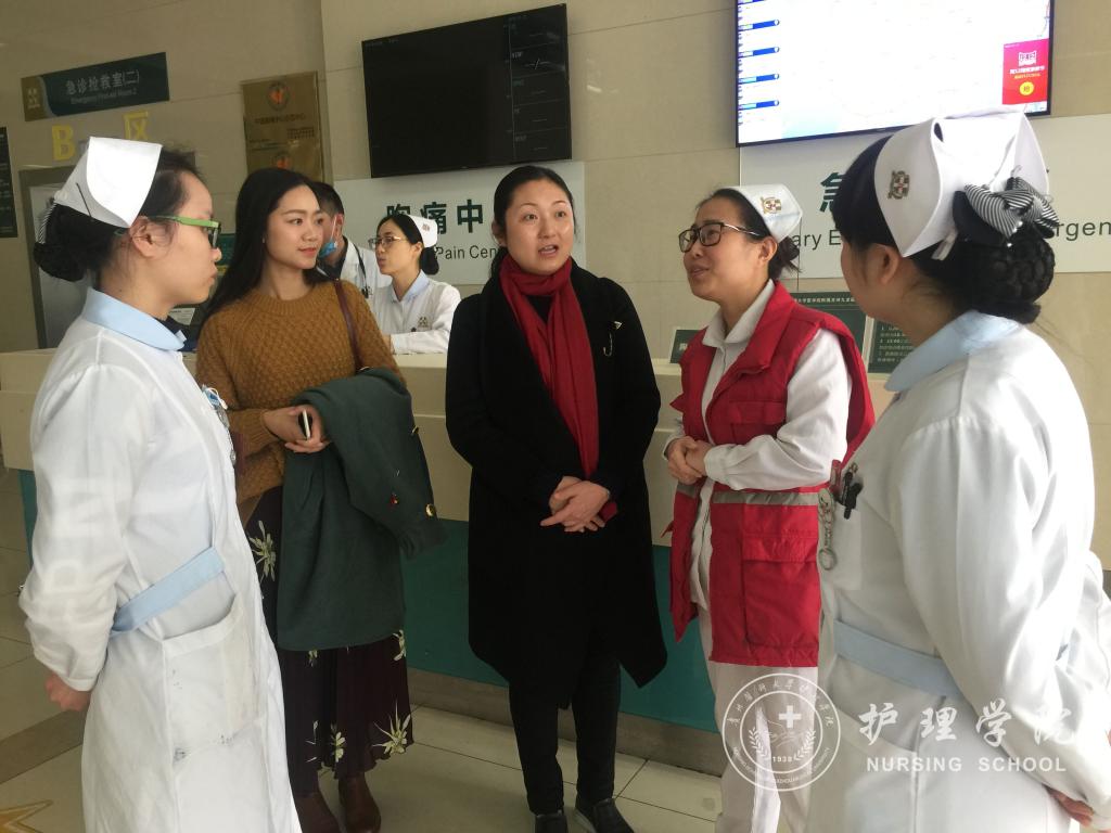 通过座谈,了解到鸭脖实习生的表现得到了医院的高度肯定,实习医院也热情欢迎我校继续派遣同学实习,并积极与鸭脖老师商讨下一批医院实习计划。同时,护理部表示希望实习生参加本院12月份的招聘会。随后,鸭脖老师走访了消化内科,呼吸内科,儿科,泌尿外科,心外科,急诊等临床科室,并与护士长、带教老师和实习同学深入交谈,从不同方面了解实习教学以及实习中存在的问题。