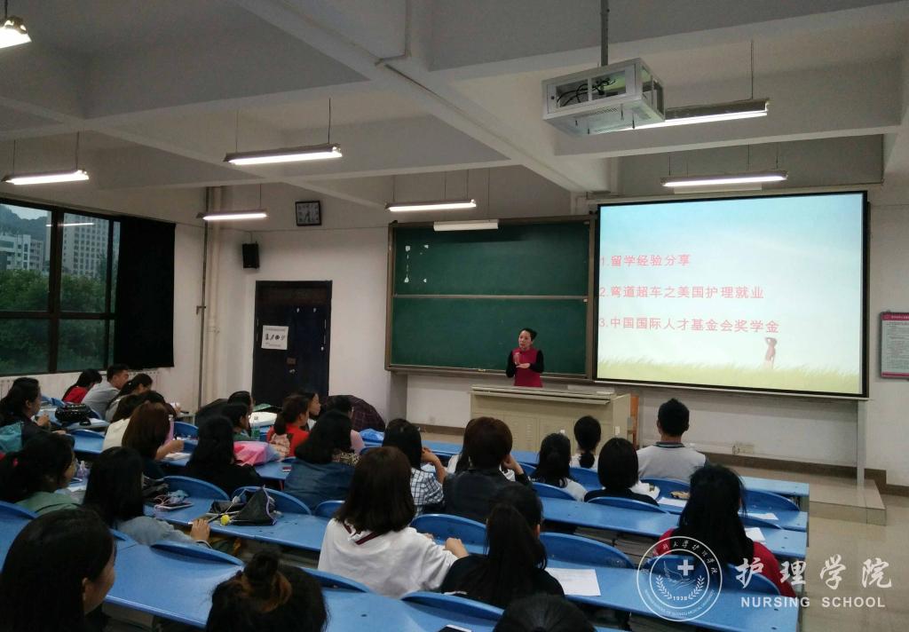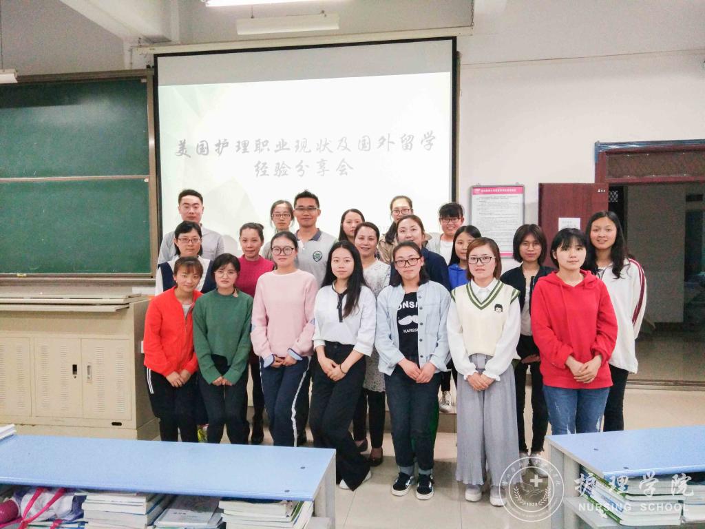 2018年5月31日下午7:00,YABO鸭脖于北校区2401教室召开了“美国护理职业现状及国外留学经验分享会”,分享会邀请到美国海格斯大学出国留学区域负责人彭冰老师为鸭脖学生进行了交流指导,YABO鸭脖党委副书记杨英、护理技能实验室主任周谊霞、学生科科长曾敏、辅导员李杏春和2014、2015级部分同学参加了此次交流会。会议由周谊霞老师主持。