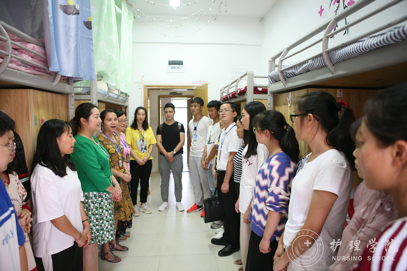 迎新工作接近尾声之际,杨英带领学生科科长曾敏、新生辅导员以及学生会干部前往新生宿舍看望2018级的同学们,杨英鼓励同学们要始终保持自信乐观心态,尽快适应大学校园生活,认真学习,热爱护理专业。