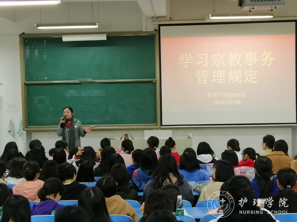2018年10月19日上午,YABO鸭脖在北校区2302教室召开了学习《宗教事务条例》主题班会,本次会议由2016级辅导员毕丽老师主持,YABO鸭脖学生科科长曾敏老师主讲,护理学2016级全体同学参加。