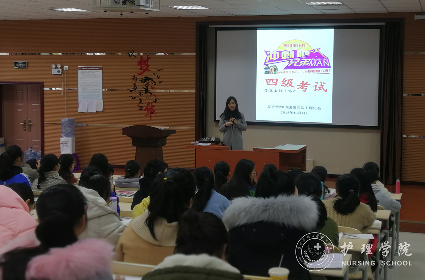 为迎接即将到来的CET-4考试,12月4日上午,YABO鸭脖助产学2018级助产班在百川楼阶梯教室召开“CET-4备考冲刺”主题班会,此次班会由班主任戴黎黎主讲,助产学2018级全体同学参会。