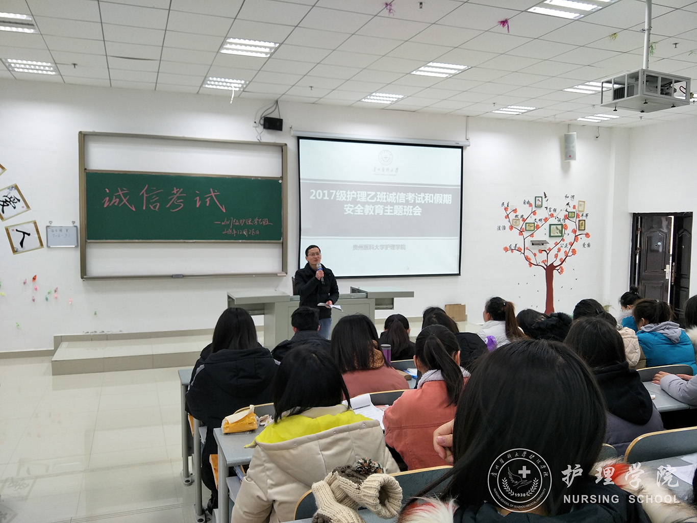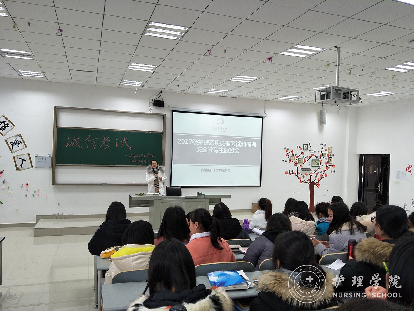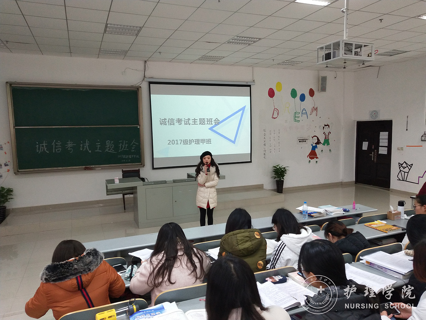 12月28日下午,YABO鸭脖在南校区7404和7406教室开展诚信考试主题班会。班会由2017级护理甲班、乙班两班班长主持,班主任吴俊、王丽和辅导员马景瑶主讲,全体同学参加。