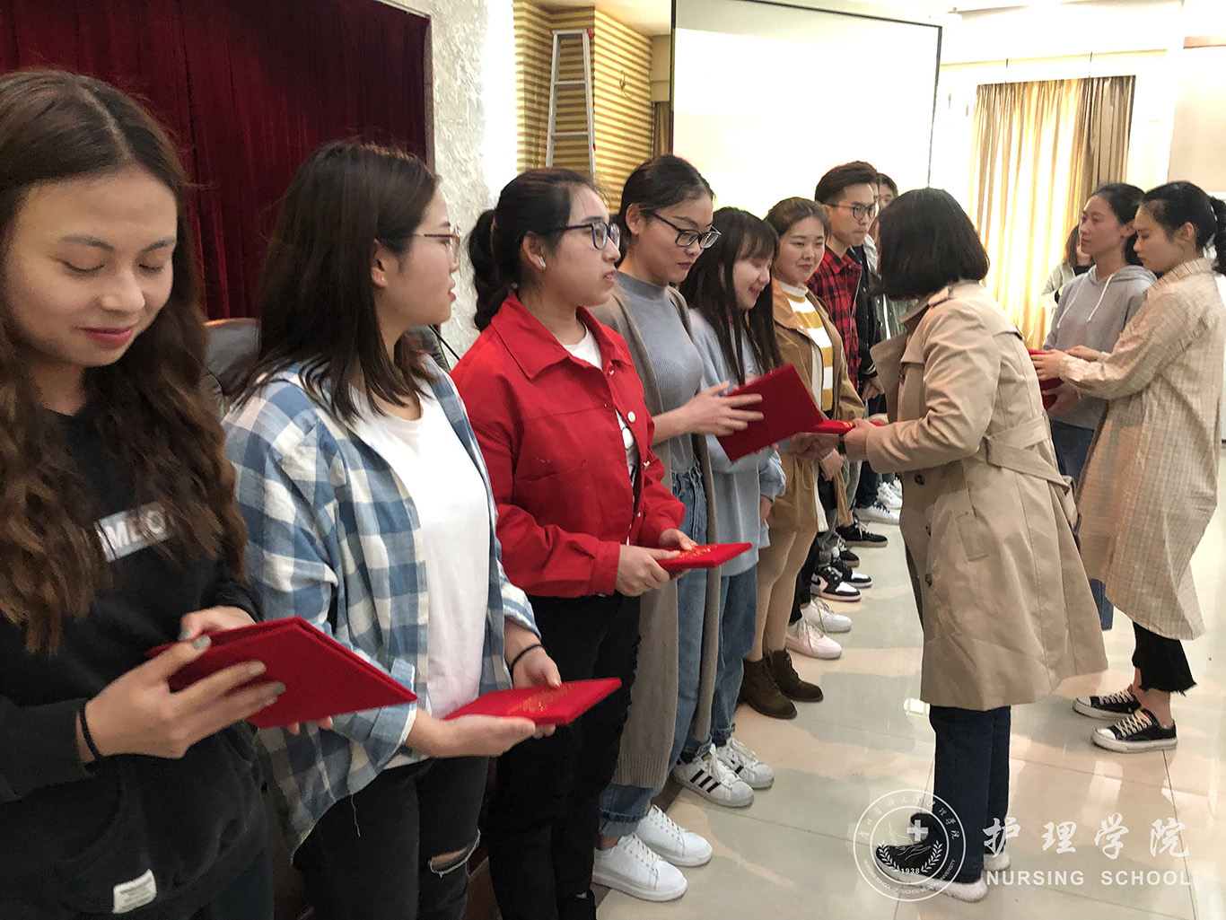 随后,王秀红宣读表彰名单,本次共表彰优秀实习生38名,优秀带教老师22名。杨英为优秀实习生颁发证书。2015级护理助产班奚可阳作为优秀实习生代表发言,他讲到“实习是一个角色转变的过程,实习帮助我们更加清晰地认识了自己”,充分肯定实习带给他的成长和收获。
