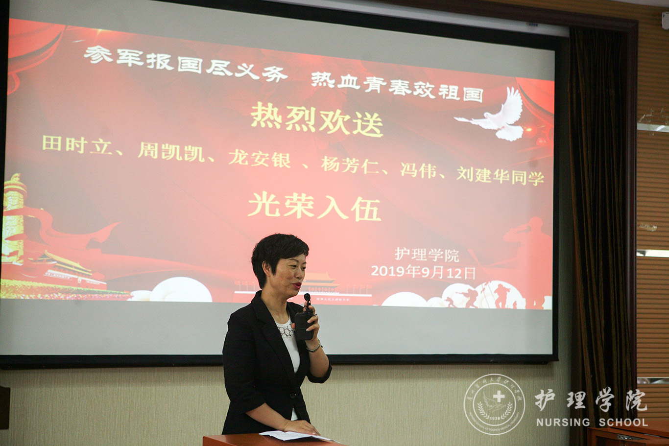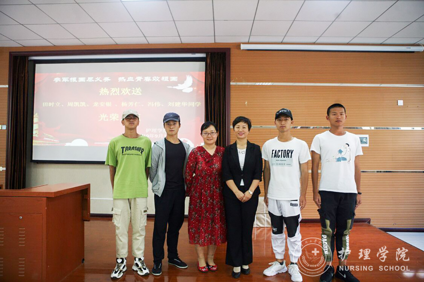 参军报国尽义务,热血青年报效祖国。YABO鸭脖周凯凯、田时立、龙安银、杨芳仁、冯伟、刘建华6位同学积极响应国家大学生应征入伍号召,满怀一腔爱国热情报名参军,在家人和各有关部门的支持下,终于实现了携笔从戎报国志向。王秀红提到依法服兵役,是我们每个公民应尽的义务,参军报国,是我们新世纪青年的热切向往。学院师生有着光荣的爱国历史,素来就有同学积极入伍报效国家的优良传统她希望入伍的几位同学,尽快转变角色,加强学习,提高政治素养;忠于职守,保家卫国;严守纪律,发扬贵医精神,到部队后积极发挥大学生士兵的优势,锻炼提升自己的同时,为部队的发展建设做出应有的贡献。同时,她代表学院对6位同学承诺:YABO鸭脖的大门永远向你们敞开,期待你们凯旋,归来还是护理一分子。
