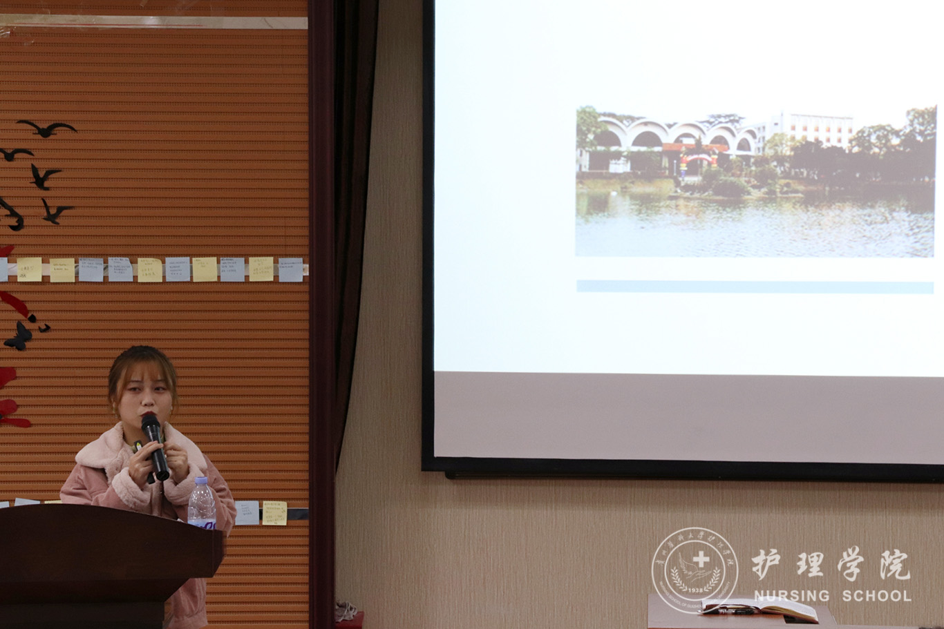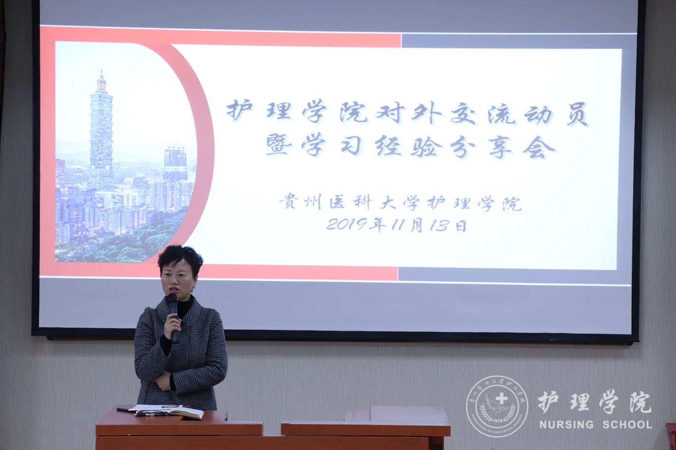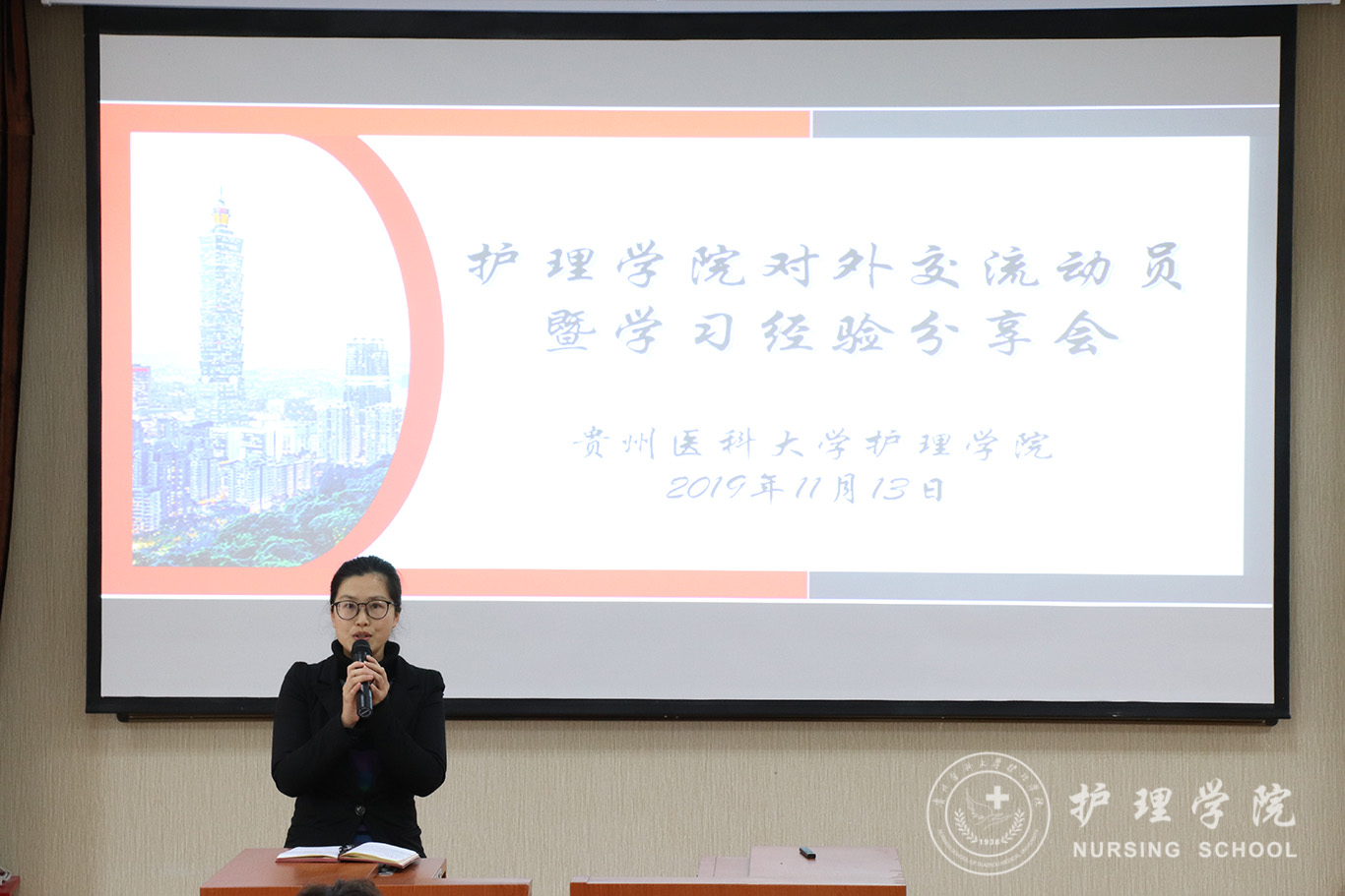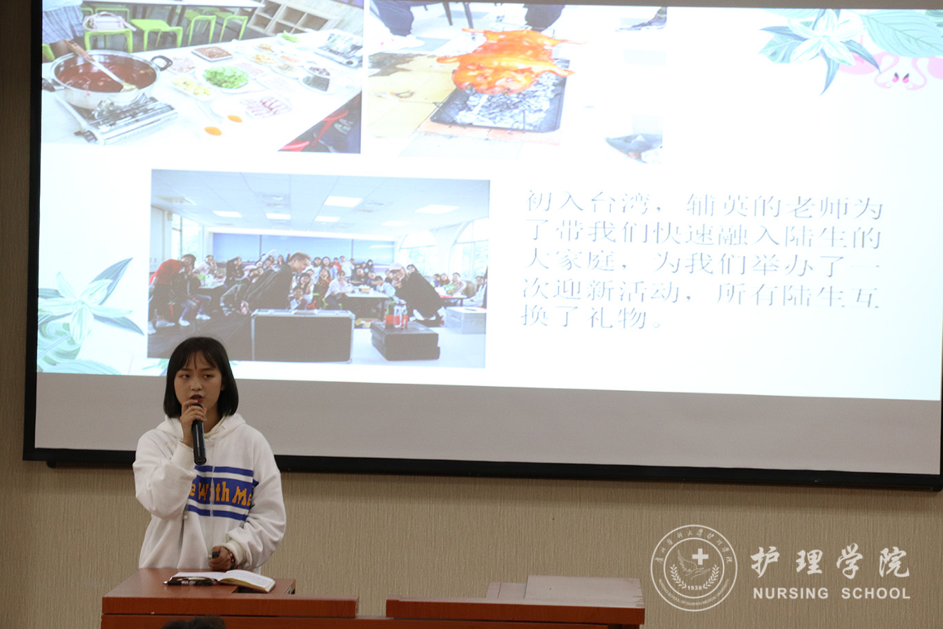 首先,毕丽解读了学校关于选拔学生赴境外交流学习的相关文件精神,对2020年春季对外交流学习项目进行了简要介绍。接下来,护理学2018级王文妮、助产学2018级焦婧两位同学分别就自己在台湾辅英科技大学一个学期的交流学习作了精彩分享。两位同学从入学前准备、课程学习、课外娱乐以及学习感悟等方面进行了详细介绍,落落大方的举止、生动自然的表达,潜心钻研学习的精神赢得了在场师生的赞誉。接下来,王秀红作对外交流动员讲话,她勉励同学们要珍惜机会,学会通过利用交换学习机会提升自己的综合能力;要树立国际视野,拓展见识,培养“走出去”意识;她嘱咐同学们:要读万卷书,也要行万里路。对外交流可以让我们及时找到差距,及时反思,促进学习由被动变为主动。青年学子要树立远大理想,不断更新观念,提升综合素质,为建设我们美丽富饶的祖国贡献更大的力量。