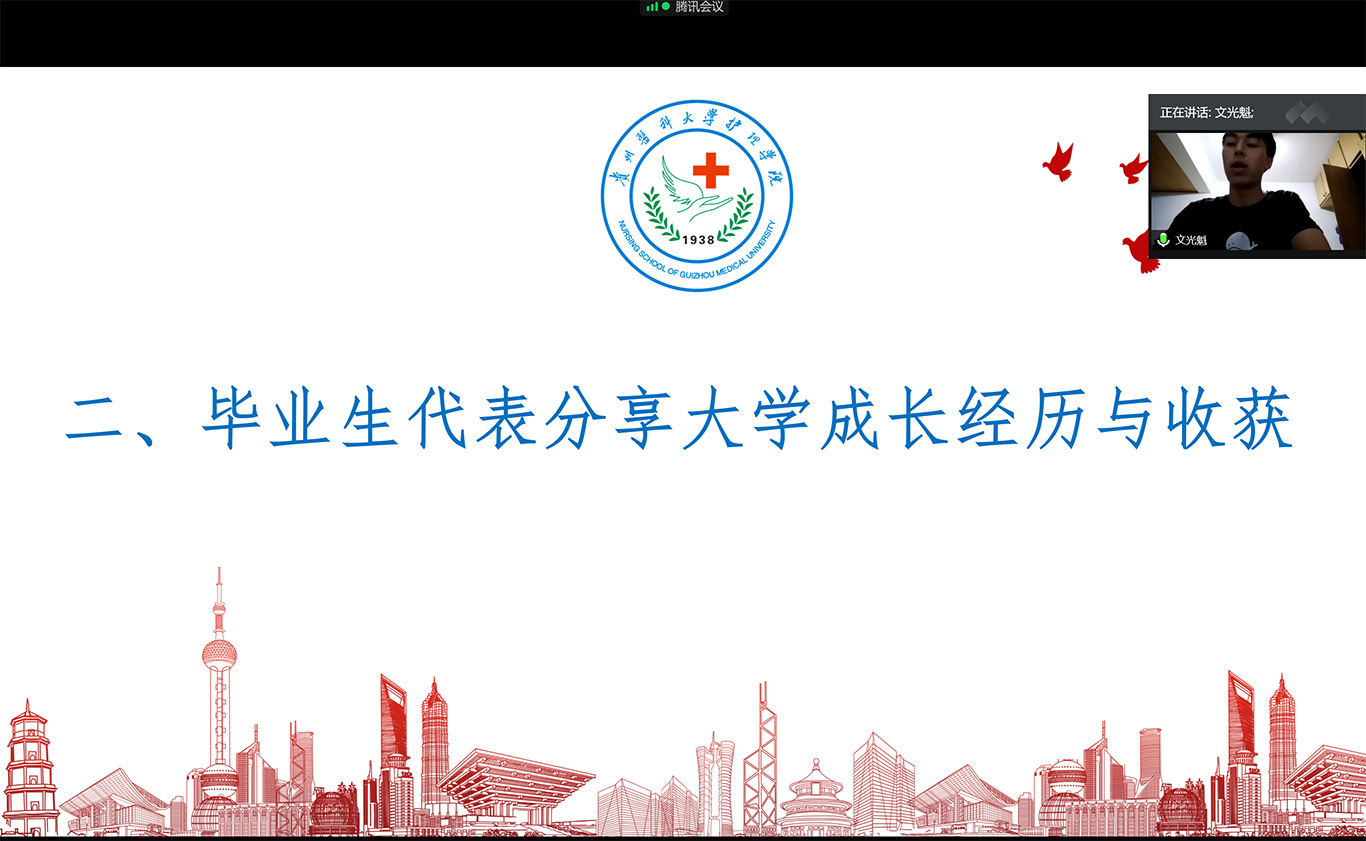 接下来,2020届毕业生文光魁、王伟月、王容三位同学作为毕业生代表分享了大学四年在贵医的成长经历与收获。跟着三位同学的分享,大家共同回忆进入贵医后的点点滴滴,回味了大学生活中的喜怒哀乐,追忆青春、畅想未来。三位同学代表全体2020届毕业生感谢YABO鸭脖全体老师、感恩贵医,同学们决心将大学的美好记忆带到工作岗位,不忘初心,砥砺前行。