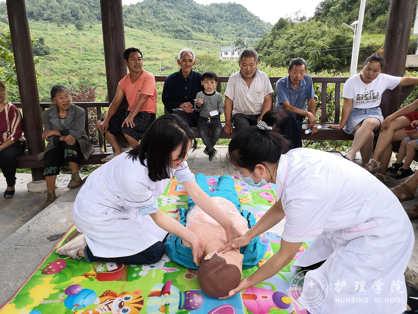 第二天,队员们早早来到村里。村子外面的小河一到夏天是孩子们戏水玩耍的去处。这一天的主要活动,就是针对儿童进行防溺水安全和相关急救技术培训。队员们利用带去的仿真模型,召集村里的孩子和家长们,展开了生动的讲解和现场示范。心肺复苏、海姆立克急救这些生活中必备的急救技术通过队员们的教授和现场训练让孩子们学会了如何处理紧急情况、增强了人身安全保护意识。培训活动结束,队员们给孩子们分发了口罩、体温计、学习文具等物资,和他们在一起做游戏、讲医护人员抗击新冠肺炎疫情的感人事迹、组织糖果分享会,一天的活动在孩子们的欢笑声中落下帷幕。