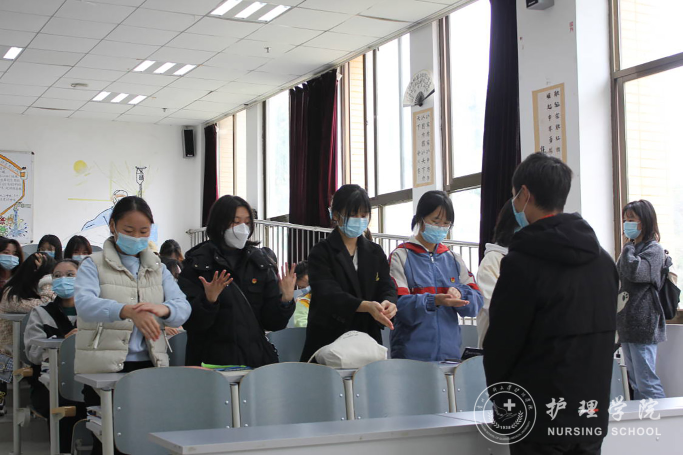 为使活动取得实在成效,把正确的“七步洗手法”普及到各班,活动之前,各组小组长认真检查了同学们“七步洗手法”操作前的准备工作,有序带领各组队员到各个流动点开展防疫科普活动,与此同时,点上的每位同学在校园内随机寻找5-10名不会“七步洗手法”的行人进行科普宣传,这其中包括非医学专业的同学、校园里的保洁阿姨、保安等等。