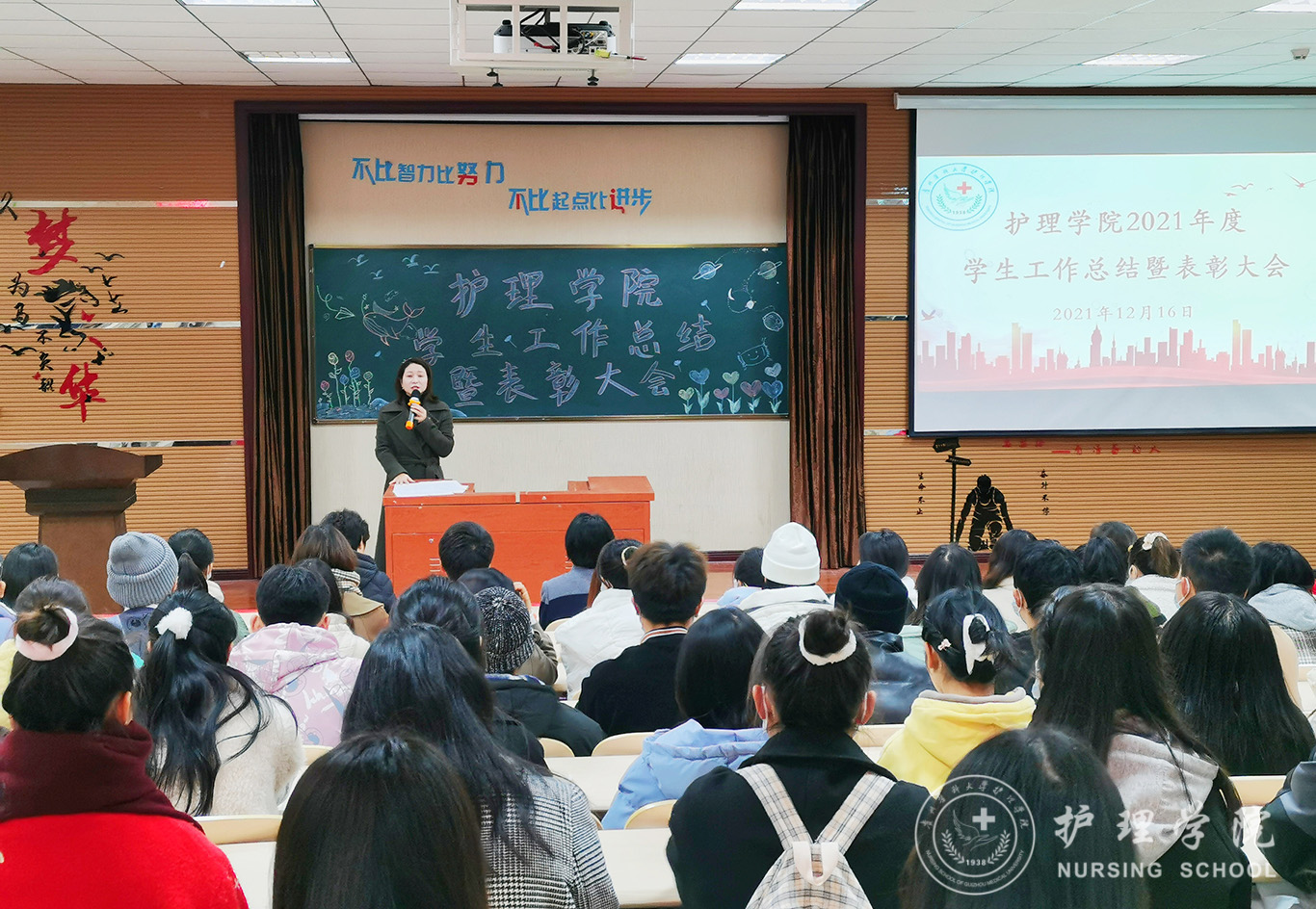 本次大会共有五项议程。首先,副处级组织员张黎作2021年学生工作总结报告,她从抓牢思想建设、抓好团学工作、抓严学生管理、抓实专项工作、创新校园文化活动、助力疫情防控等六个方面总结了2021年度学院学生工作开展情况。接下来,副院长王秀红宣读了先进集体和优秀个人获奖名单。紧接着,助产学2020级肖春同学代表全体学生发言:她结合自己的学习和援遵抗疫经历,分享了这一年的收获与感受,号召大家要勇担时代使命,做新时代的追梦人。