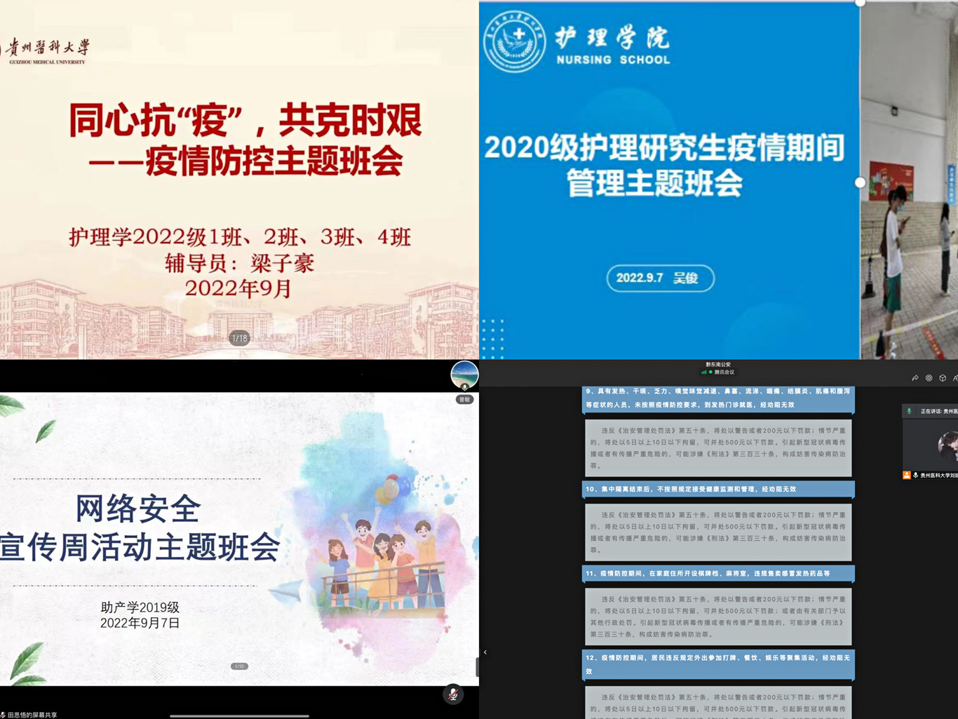 会上,辅导员解读了疫情期间学校静默管理规定,强调非必要不离寝,并对学生常见心理问题进行了疏导,帮助学生克服恐慌等不良情绪。随后通报了相关人员在疫情防控工作中失职失责的问题,宣读了《关于对疫情防控工作中不如实填报个人信息的通报》,要求全体同学充分汲取教训,对照自查自省,引以为戒,深刻认识疫情防控工作的重要性,加深对疫情防控法律法规的敬畏之心,并强调全体学生必须按时按要求准确完成每日信息填报。最后对《30种疫情防控违规违法行为及法律后果》进行详细讲解,告诫大家做遵纪守法的好公民,积极主动配合完成疫情防控工作。