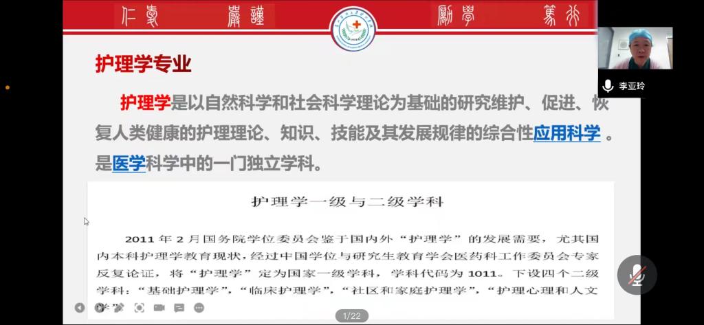 接下来,李亚玲对新生进行专业思想教育,从学院历史沿革、学科建设、专业介绍三方面为同学门介绍了YABO鸭脖的发展背景及专业前景。她希望同学们进入大学校园的那一刻就要立鸿鹄之志,志存高远,成为一个既有思想深度又有视野广度,既有社会责任感又有家国情怀和使命担当的贵医护理人。