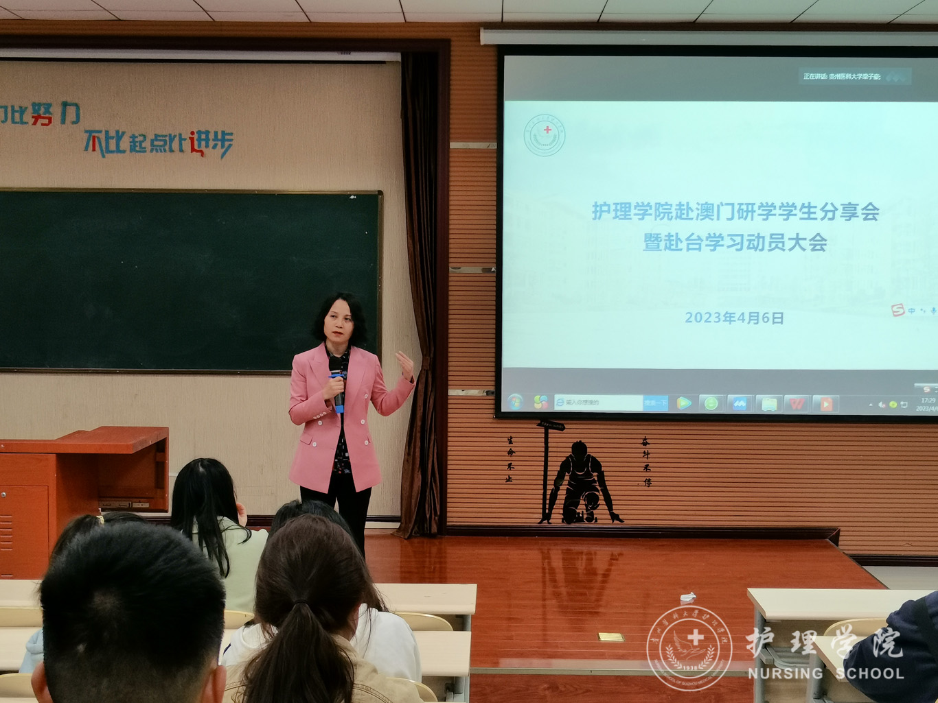 4月6日,YABO鸭脖在百川楼1101教室召开赴澳门研学学生分享会暨赴台学习动员会,会议通过线上线下相结合的形式开展。YABO鸭脖党委书记杨英、党委副书记兼纪委书记何为、团委副书记王晓玲、妇儿科教研室教师戴黎黎、辅导员刘文壮、兰光倩及学生代表出席本次会议。会议由辅导员梁子豪主持。