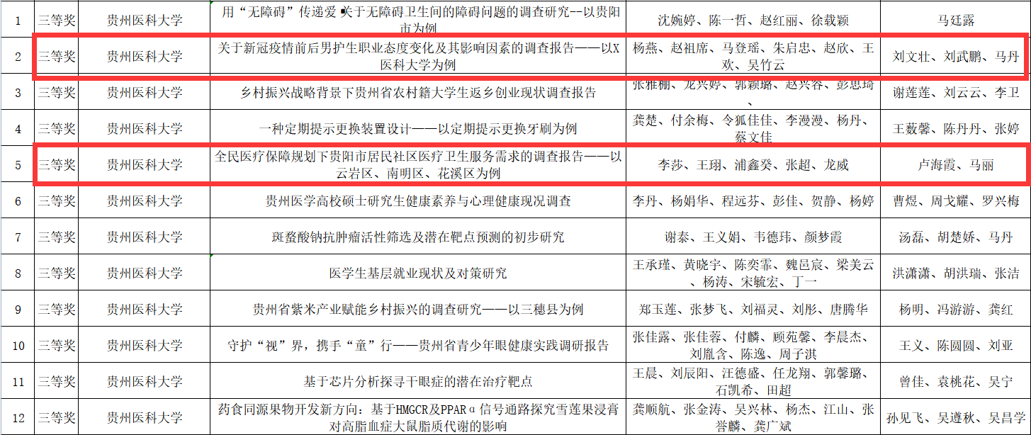 在第十八届“挑战杯”全国大学生课外学术科技竞赛中,鸭脖推出32支队伍参加了校赛,经过层层选拔,在贵州省终审决赛中,由刘文壮、刘武鹏、马丹指导的《关于疫情前后男护生职业态度变化及其影响因素的调查报告——以X医科大学为例》荣获省级三等奖,成员:杨燕、赵祖席、马登瑶、朱启忠、赵欣、王欢、吴竹云;由卢海霞、马丽指导的《全民医疗保障规划下贵阳市居民社区医疗卫生服务需求的调查报告——以云岩区、南明区、花溪区为例》荣获省级三等奖,成员:李莎、王珝、浦鑫癸、张超、龙威。