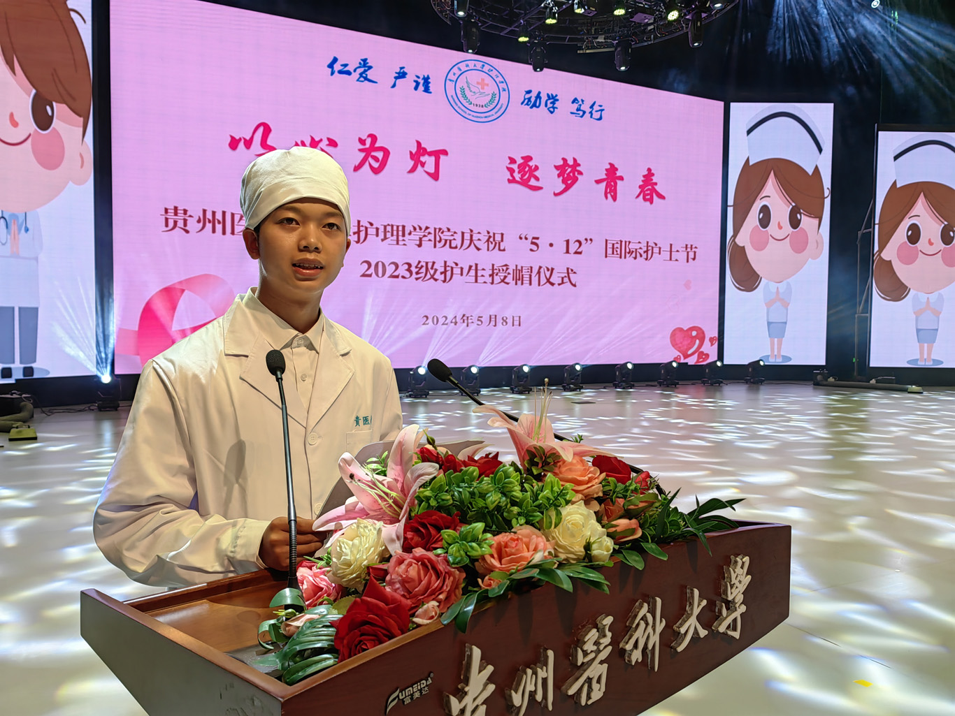 随后,护理学2023级5班学生王小猛代表全体受帽护生作了发言。2022级护生进行了护士礼仪展示和诗歌朗诵,充分展现了护理学子的良好礼仪修养与白衣天使的职业形象,给同学们带来一场视觉盛宴,赢得阵阵掌声。