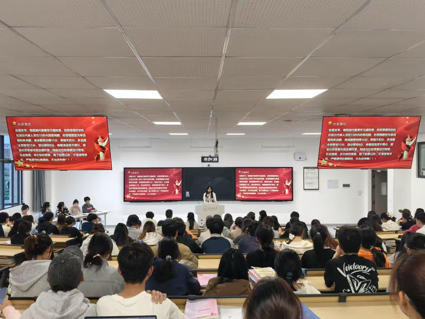 活动分为必答和抢答两个环节。在必答环节,各小组按序作答,展现出扎实的知识储备与沉稳的应答能力。而抢答环节,更是把现场气氛推向高潮。小组间围绕题目展开激烈角逐,凭借敏捷的思维、快速的反应及良好的团队协作争夺答题权,多次出现比分交替上升的紧张局面,充分彰显了当代青年积极进取的风采。