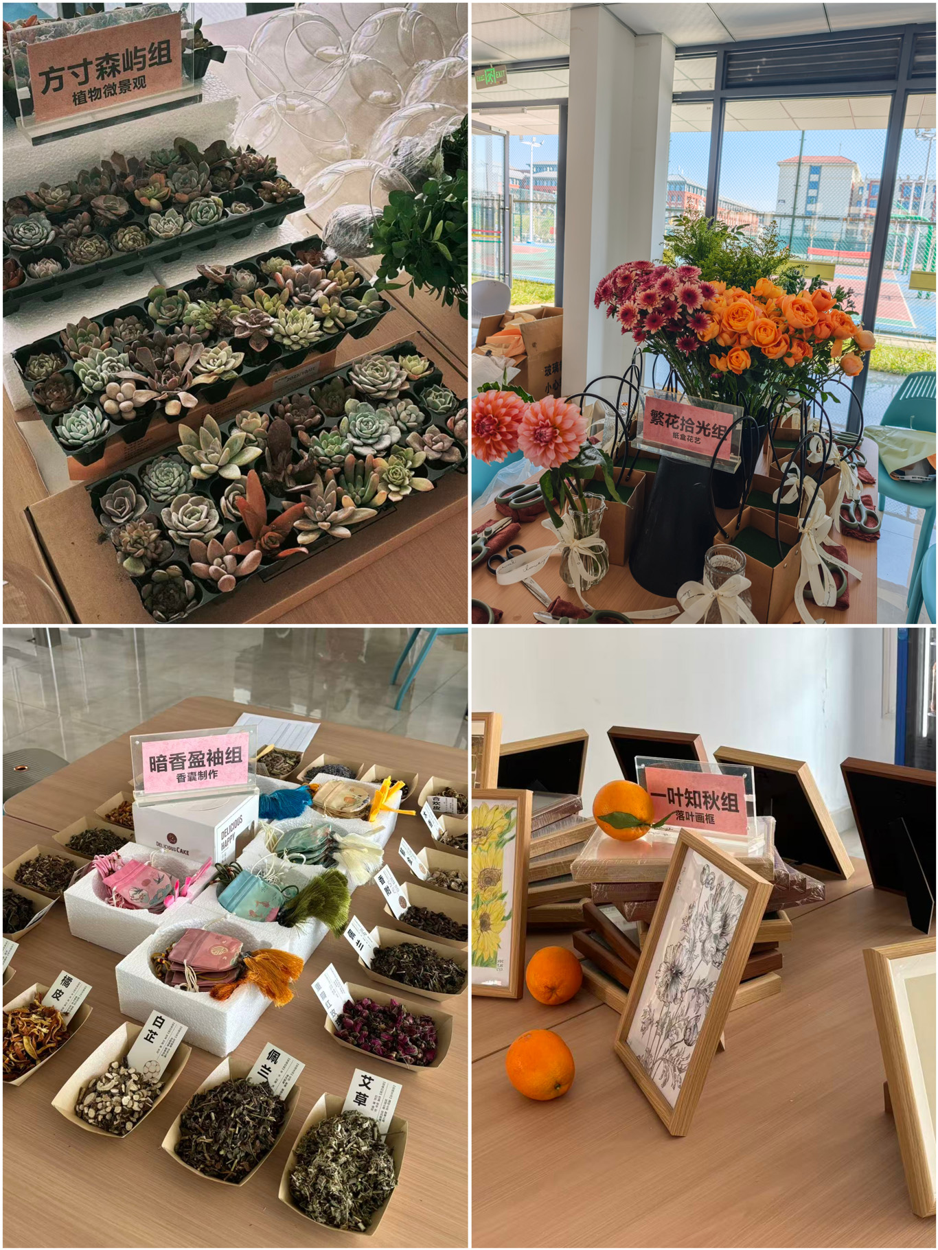 活动现场氛围热烈又专注,四大特色环节同步开展,每个环节都充满创意与温度。“方寸森屿组”内,同学们俯身挑选网纹草、多肉植物、小石子等素材,小心翼翼地铺土、调整绿植角度,打造出专属心灵栖息地;“繁花拾光组” 里,大家斜剪花茎、高低错落插制的技巧,将大丽花、果汁阳台、小雏菊等鲜花插入纸盒,专注修剪、调整花材朝向,让闲置纸盒在创意点缀中焕发艺术生命力;“一叶知秋组” 的同学们穿梭于社区收集好看的落叶、落花、落果等自然植物素材,仔细比对叶片的形状、色彩与纹理,回到创作区后平铺素材、构思构图,用胶水细心固定、用马克笔轻描叶脉,在调整每一片落叶位置的过程中,让自然意象与内心情绪精准契合;“暗香盈袖组”中,大家围坐在一起闻薰衣草、陈皮、艾草等香料气味,将舒缓心绪的香料妥帖收纳,鼻尖萦绕的天然暗香与专注氛围相互交融。活动开展过程中,殷艳充分发挥专业优势,细致讲解植物疗愈原理、鲜花插制等技巧。