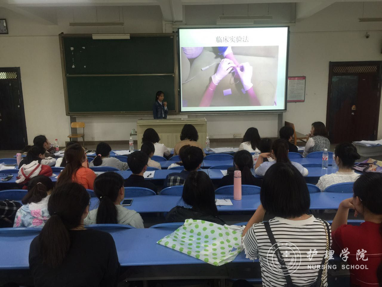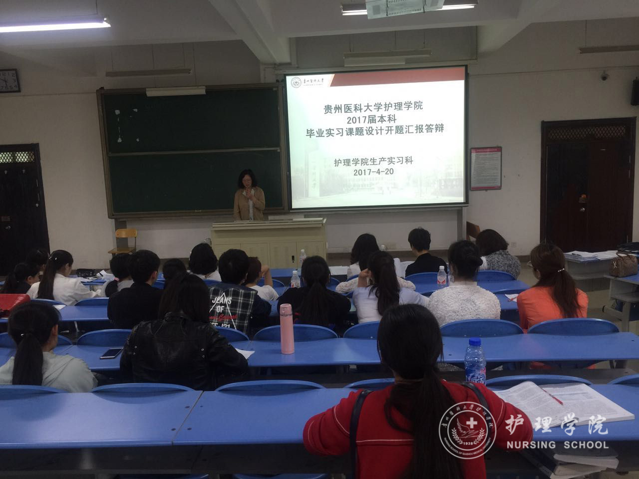 答辩会开始前由主持人介绍了今日答辩会主题,分配学生汇报时间。答辩会开始后,由2013级实习生每组代表用PPT形式向大家展示她们的课题设计,答辩评委从多个角度对同学们的课题设计提出问题,同学们对评委专家的提问一一进行了认真的回答。评委、老师们还对学生课题设计中尚需改进之处给予了中肯的建议。最后,郭院长作了总结点评,对部分有创新性的课题设计如:头皮针改良设计、护理专升本学生实习积极性影响因素的研究等提出了表扬。并鼓励同学们在今后工作中进一步继续完成课题设计的研究。