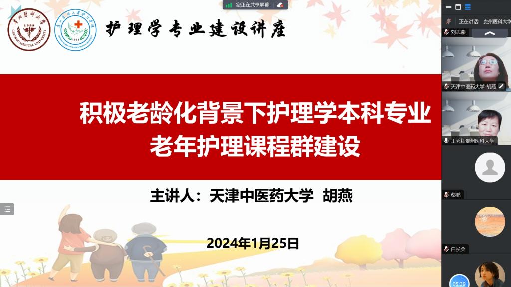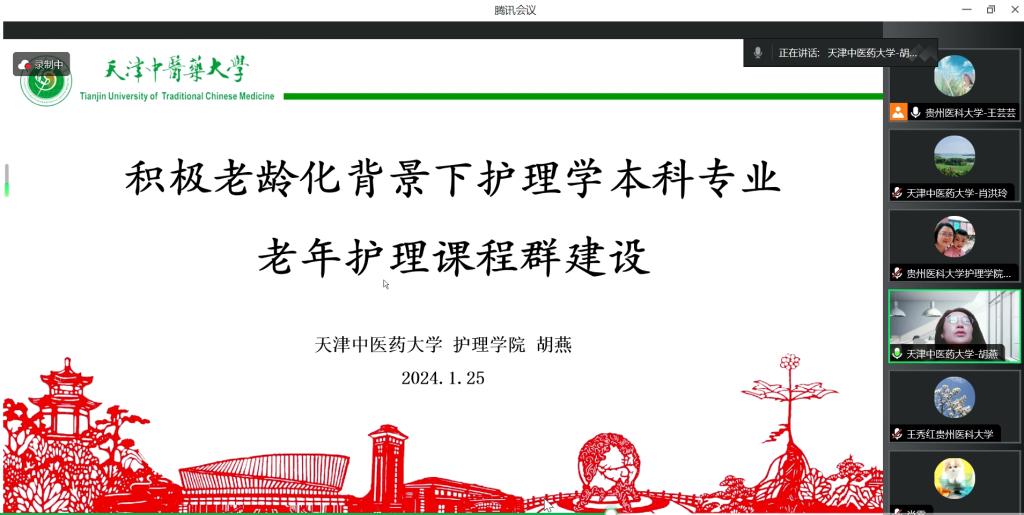 胡燕以《积极老龄化背景下护理学本科专业老年护理课程群建设》为题,从中国人口老龄化背景引入,以天中医老年护理课程群建设为主线,介绍了老年护理课程群的组成及特色,分别从《老年社会学》《老年病与长期照护》《老年护理临床思维综合训练》等7门课程的课程目标、教学方法、教学评价方式等方面详细阐述了课程实施和取得的成效,展示了该院老年护理学教学改革取得天津市教学成果奖一等奖的历程。之后,双方教师围绕老年护理人才培养和教学展开了热烈的互动沟通。