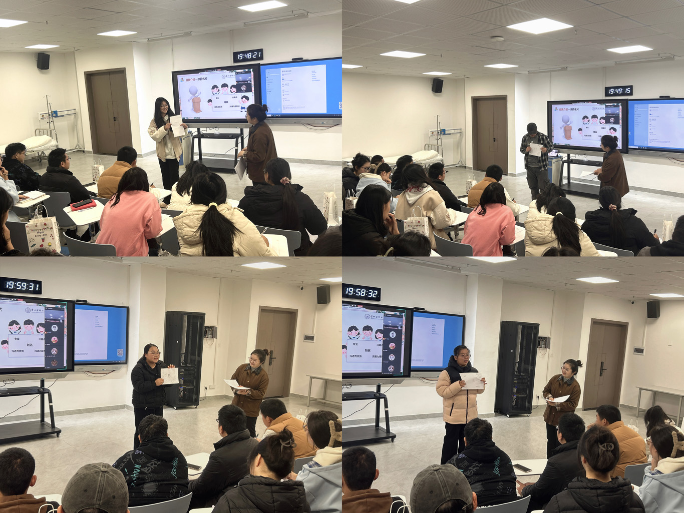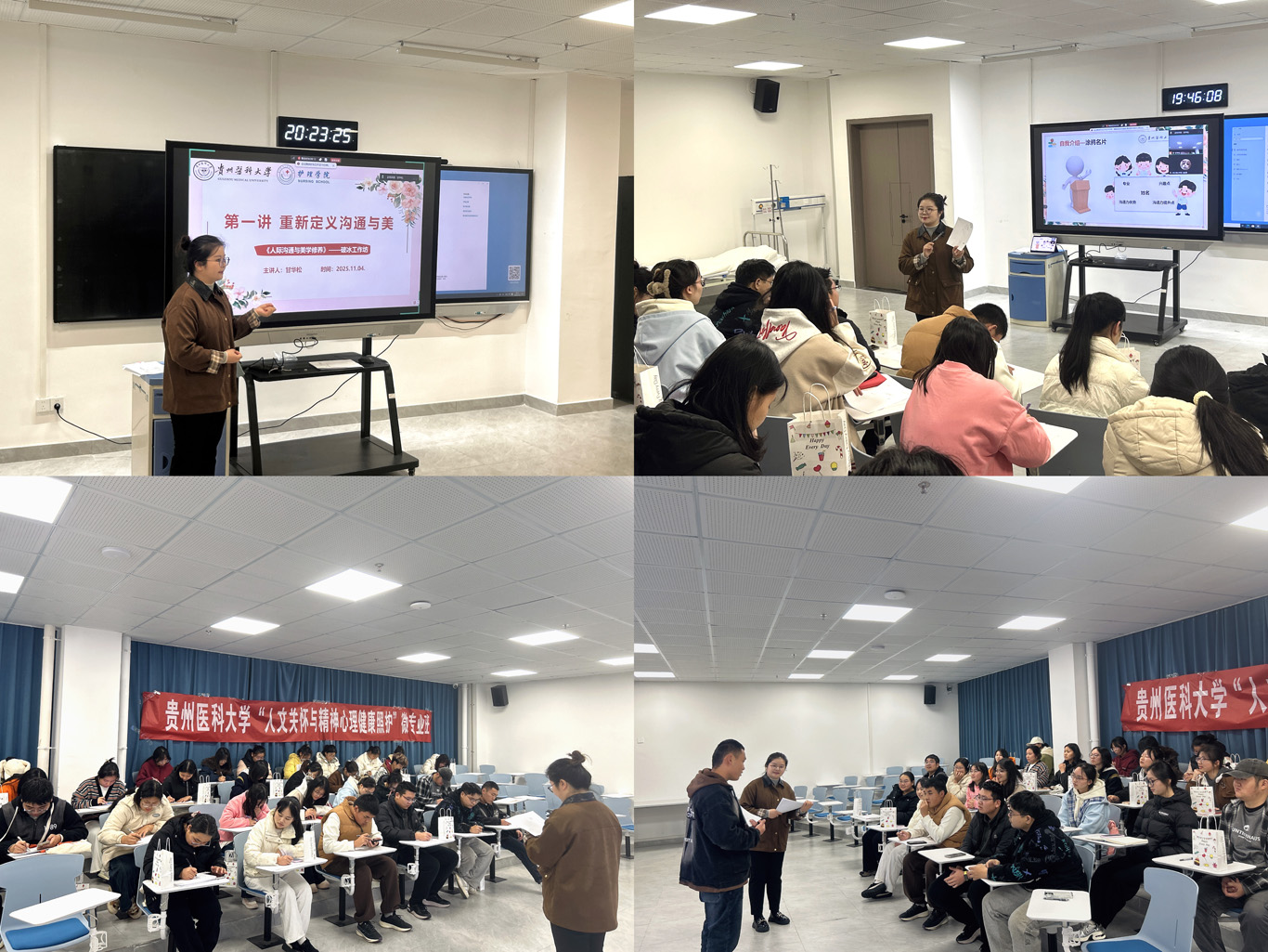 随后,甘华松老师为同学们带来了《人际沟通与美学修养》第一课。课程从沟通困境入手,引导同学们重新审视日常交流行为,并引出“沟通美学”这一核心概念。她强调,沟通不仅是信息的传递,更是个人内在修养的外在表达。通过案例分析与互动研讨,同学们深刻理解了“清晰表达、真诚共情与积极倾听”在医疗场景中的重要作用,也对如何在专业实践中塑造职业形象、提升沟通品质有了更全面的认识。课堂氛围活跃,师生互动热烈。