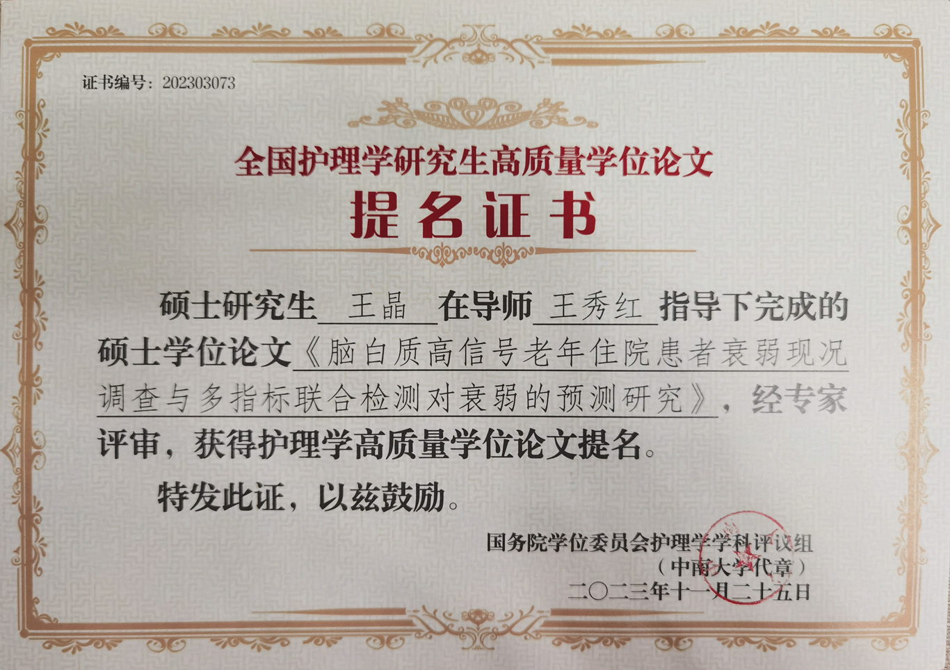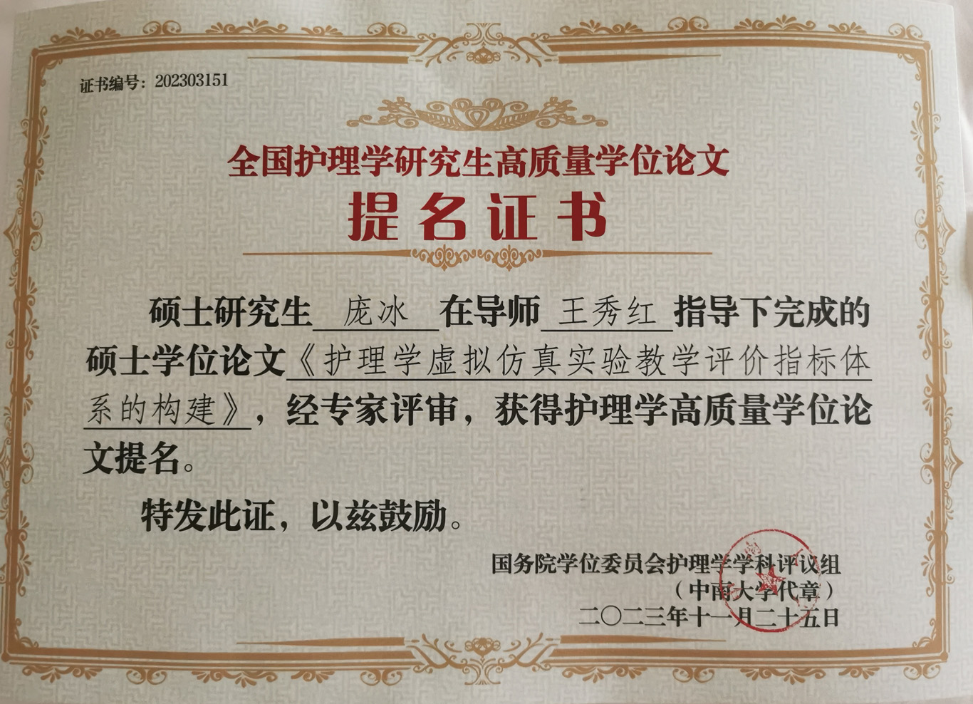 会议公布了前期由教育部护理学学科评议组开展的“高质量学位论文评选工作”情况及结果。来自全国70余所院校、2020届到2023届232篇博士硕士优秀论文进入评选目录。由研究生导师王秀红指导的YABO鸭脖2021届护理学学硕研究生王晶、2023届护理学学硕研究生庞冰的学位论文获评高质量学位论文提名奖。