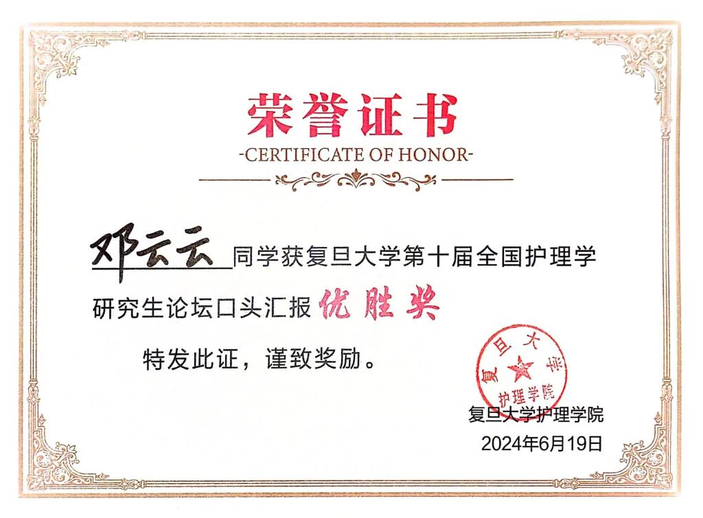2021级护理专硕邓云云同学荣获“口头汇报优胜奖”。她的论文题目为《烧伤患者尊严现状调查及尊严疗法应用效果研究》,指导教师为谭惠仪主任护师。该论文以烧伤患者为研究对象,了解烧伤患者尊严现状及影响因素,并探讨尊严疗法对烧伤患者的应用效果。该论文选题创新性和临床意义得到了与会专家充分肯定。