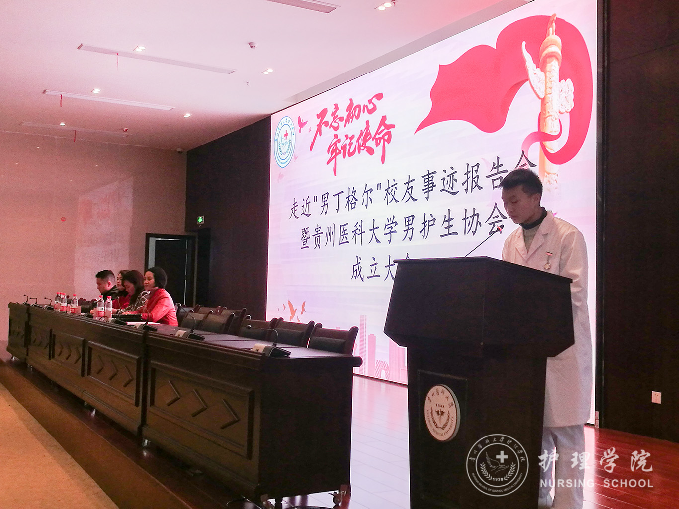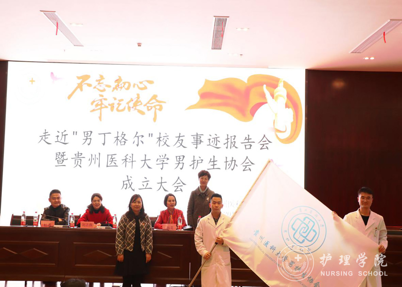为进一步提升男护生的专业认知和学习兴趣,为男护生提供一个更广阔的学习交流和提升的平台,更好地帮助同学们做好职业生涯规划、坚定专业思想,并以此平台展示贵医男护生形象,让社会更多地了解男护生、了解护理,真正实现“无性别差异的护理”。YABO鸭脖于2019年12月17日下午在南校区道德讲堂召开“不忘初心、牢记使命”走进“男”丁格尔校友事迹报告会暨YABO鸭脖男护生协会成立大会。校团委副书记(正处级)桂晓玲、YABO鸭脖党委书记杨英、党委副书记王秀红、副院长刘志燕、校友贵州省人民医院急诊留观输液中心护士长杜伟、YABO鸭脖教师、男护生协会成员及各班学生代表参加大会,大会由王秀红主持。