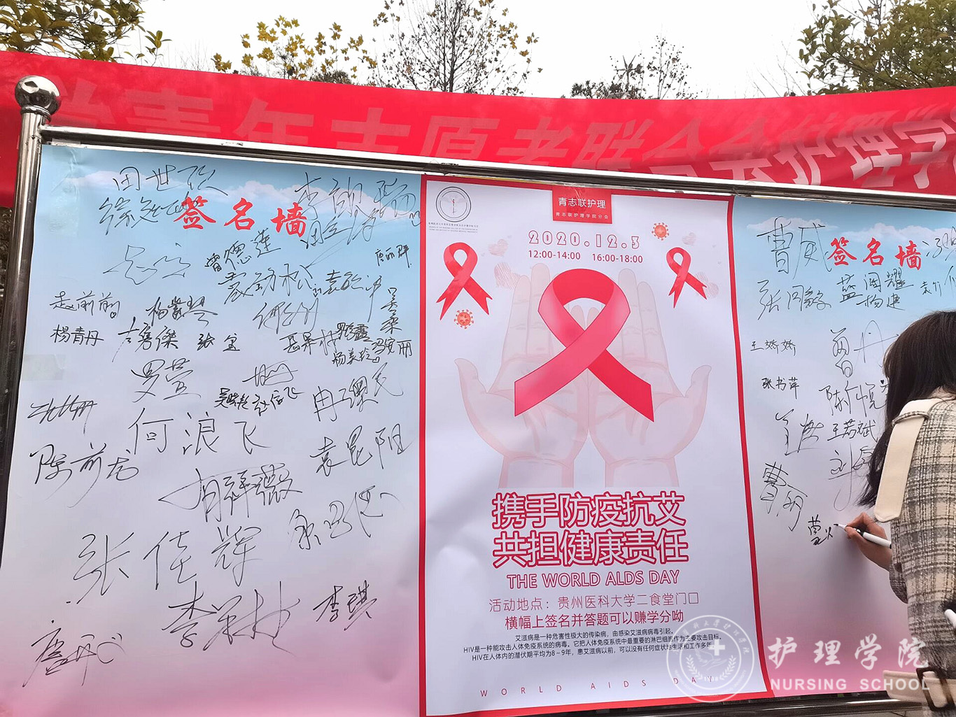 在活动现场,同学们认真的向大家宣传防艾知识,通过艾滋病知识问答的形式,使同学们了解到艾滋病的危害和传播途径,增强防艾意识,树立“预防艾滋病、从自身做起”的理念,筑起防艾的第一道防线。青分会还通过到活动现场抽取礼品、艾滋病宣传签字墙签字等形式使学生们有了更强的参与感,更加重视艾滋病的防治。最后,青分会还录制了具有护理专业特色的防治艾滋病知识宣传视频,让同学们增强防艾意识,使更多人坚定参与防艾斗争的决心,担当起健康责任。