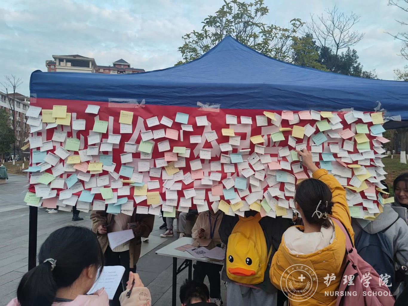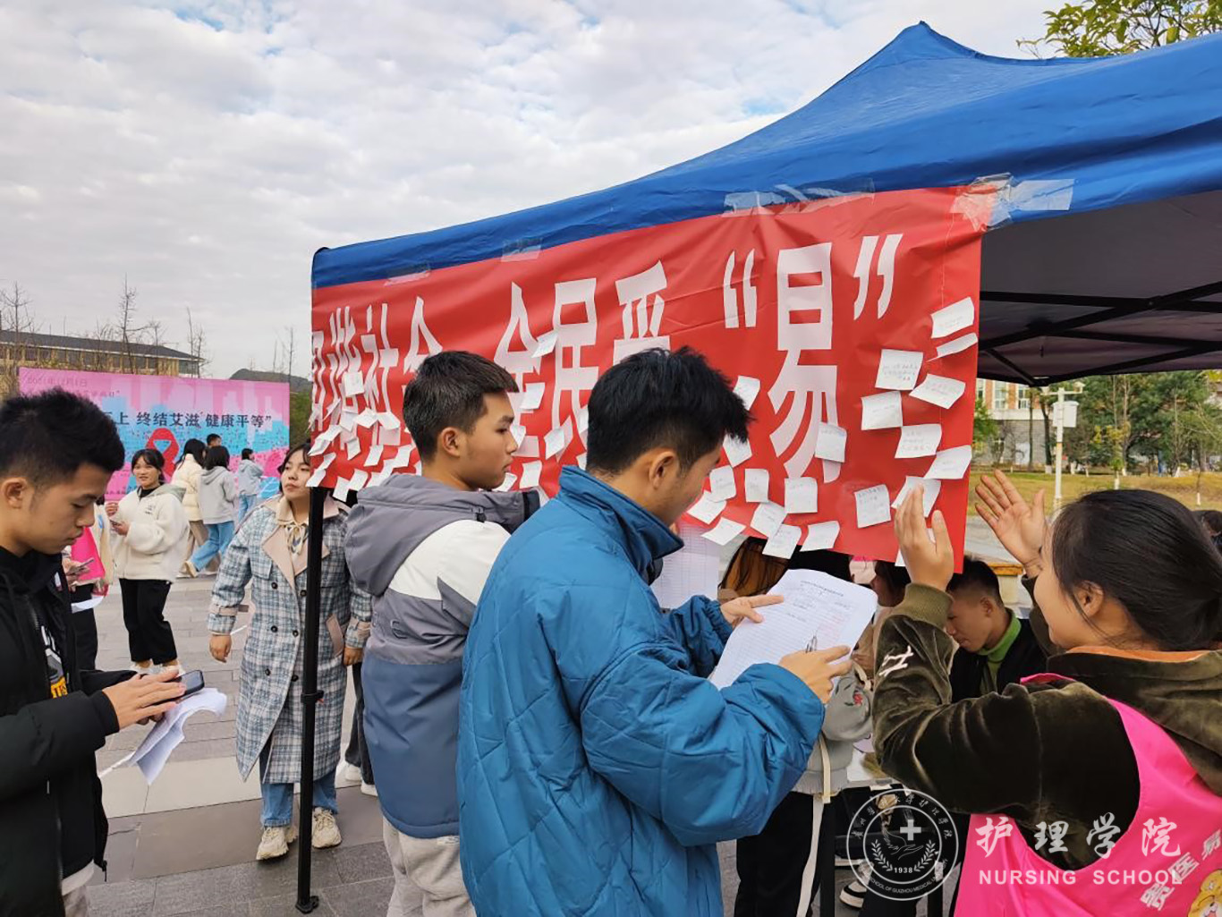 活动开始前,易班分站的成员们精心布置活动场地、准备活动奖品,活动中,向来参加的同学们耐心讲解“防艾知识”,并鼓励他们转发易班分站提前编辑好的qq空间防艾宣传语,宣传艾滋病日。活动现场,分站的志愿者们通过悬挂宣传横幅、转发宣传语的形式、向过往同学详细讲解艾滋病传播途径、预防措施和有关常识,并鼓励同学们在便利贴上手写祝福语,张贴在横幅上。与此同时,转发空间宣传语并积满58个赞的同学还可以现场进行“套圈游戏”,获取精美奖品,活动现场热闹非凡。