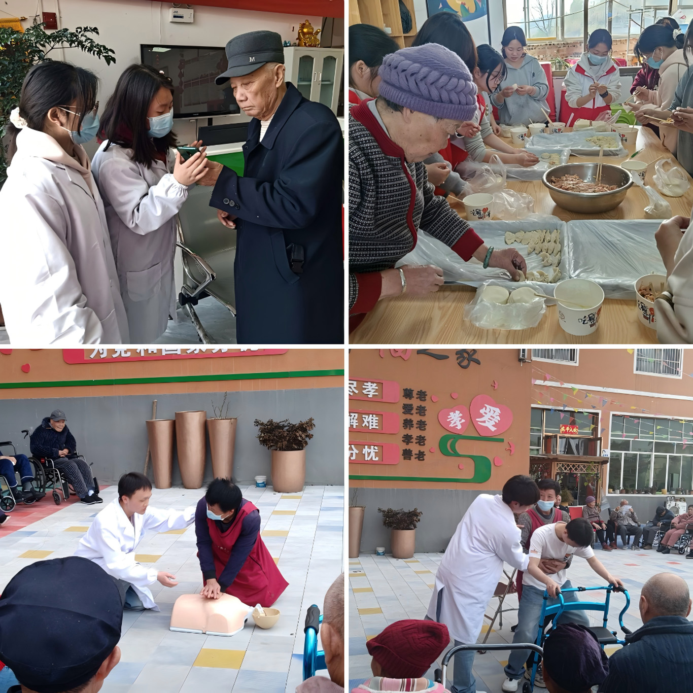 活动期间,志愿者们展现了良好的人文关怀素养,为老人们提供了丰富贴心的服务。在健康关怀上,志愿者们认真细致地为老年人测量记录血压,耐心解答老人们的各种健康疑问,详细记录测量数据,并根据专业知识给予合理的健康建议。在生活照护上,志愿者们耐心同老人们聊天,认真倾听他们讲述过往的故事,给予老人们情感上的陪伴与慰藉,志愿者们还为老人们亲手包了饺子,让老人们品尝到简单却充满青年人温暖与关爱的美食。