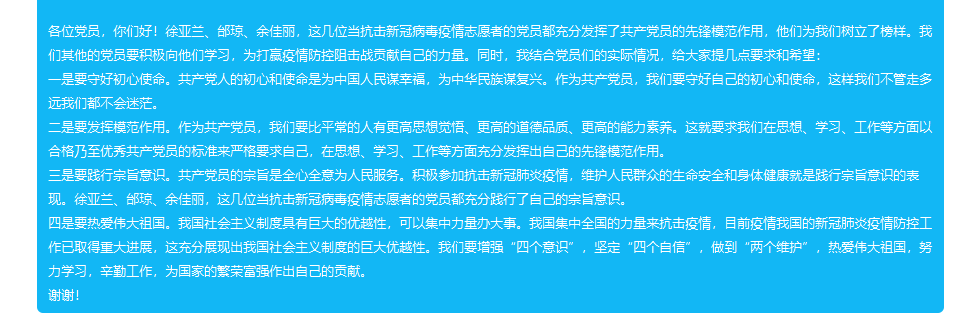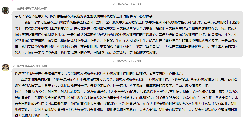 余佳丽在分享自己的战“疫”事迹时说:“作为一名正在实习的医学生和学生党员,这样的双重身份,面对当前疫情我责无旁贷,看到前辈们驰援一线,让我想起刚入校门时的医学生誓言:我志愿献身医学,热爱祖国,忠于人民,恪守医德,尊师守纪……习近平总书记强调,我们要按照坚定信心、同舟共济、科学防治、精准施策的要求,切实做好工作,同时间赛跑、与病魔较量,坚决遏制疫情蔓延势头,坚决打赢疫情防控阻击战。现在我还没有能力参与到一线抢救患者,看到疫情蔓延,既然上不了前线,那就在后方为防控疫情出一份力。”