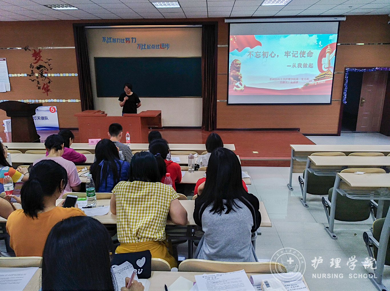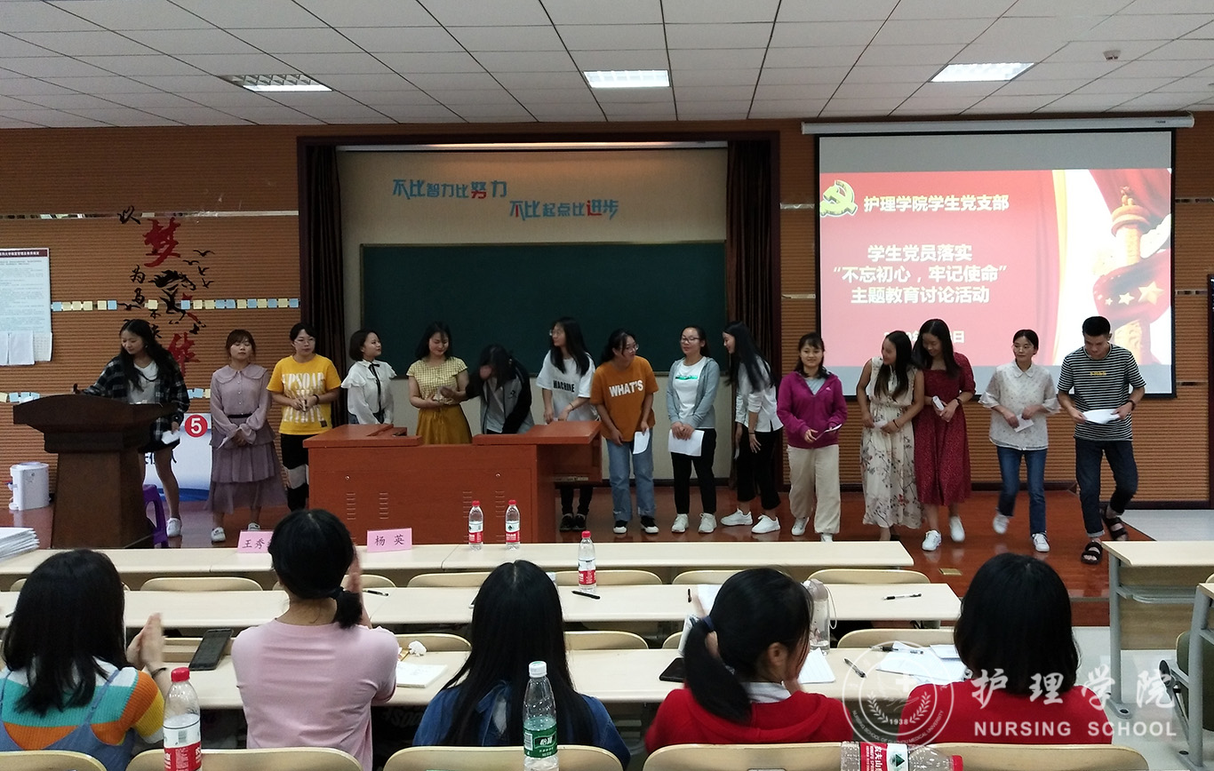 全体学生党员以班级为单位分为六个小组,每个小组以不同形式与大家分享自己对“不忘初心、牢记使命”主题教育的认识和学生党员应要如何落实要求。2016级护理学甲班的龙倩倩、张钱敏同志,围绕“初心是什么”、“为什么要不忘初心”以及“如何做到不忘初心”三个话题展开讨论,引经据典,得出结论:不忘初心要从我做起。2016级护理乙班的全体党员同志以“演说剧”的形式向大家讲述了15个已经做到了“不忘初心、牢记使命”的模范党员的感人事迹,带给全场深深的触动。2016级护理助产班的党员代表引用黄文秀和徐本禹的伟大行动事迹就“不忘初心要奉献青春”展开了话题分享,并号召大家“应当强化共产党人的初心使命意识,并落实到实际学习工作生活中去”。随着分享讨论不断深入,现场氛围愈发热烈。