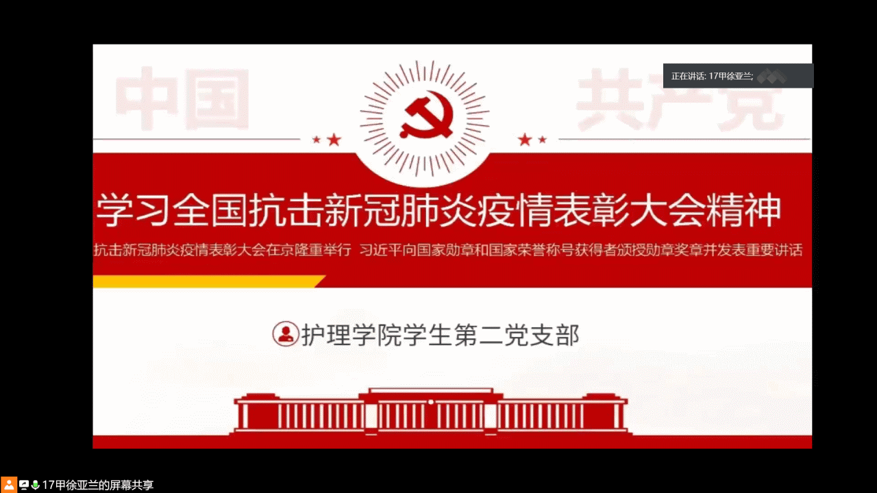 为了深入学习贯彻习近平总书记在全国抗击新冠肺炎疫情表彰大会上的重要讲话精神,9月25日,YABO鸭脖学生第二党支部组织全体党员通过腾讯会议开展了政治理论学习活动,活动由党支部组织委员徐亚兰主持。