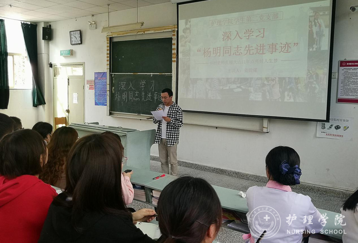 首先,蓝阔耀与大家分享了黔西县山区支教老师杨明扎根基层教书育人、无私忘我的先进事迹。学生党员学习了解到,为了促进农村教育事业新发展,让更多大山孩子能够接受教育,杨明选择放弃迪拜高新工作,扎根黔西县十余年,坚守讲台,潜心育人,充分体现了一名乡村教师对党和人民教育事业的热爱。最后蓝阔耀倡导全体学生党员要向杨明学习,学习和弘扬榜样精神,切实充分发挥党员先锋模范带头作用。
