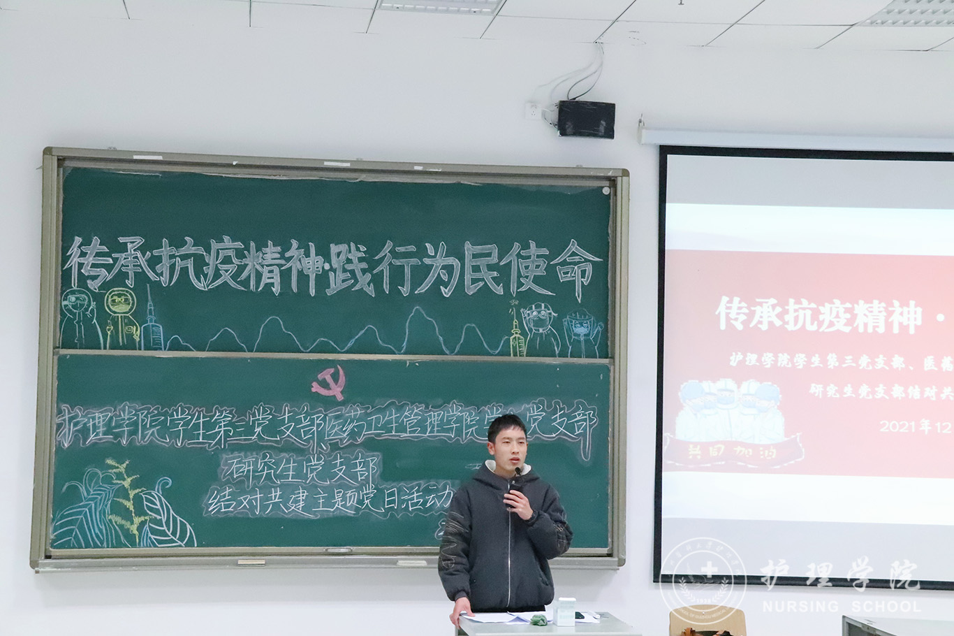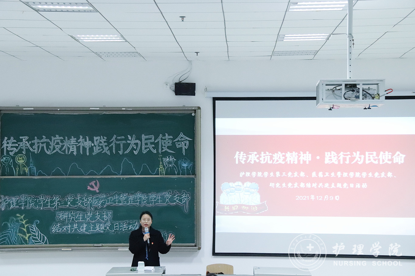为深入落实党史学习教育,积极开展支部共建,以建促改,以建促进,加强党员同志的时代责任感,YABO鸭脖学生第三党支部、医药卫生管理学院学生党支部于12月9日在南校区7202教室开展“传承抗疫精神、践行为民使命”支部共建活动。YABO鸭脖学生第三党支部书记刘妍主讲,医药卫生管理学院学生党支部宣传委员李卫主持,全体支部党员参与活动。