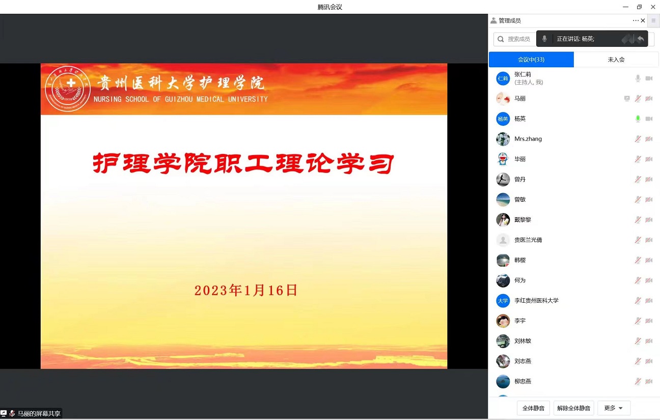 首先由教职工党支部书记张仁莉同志领学《国家主席习近平发表二〇二三年新年贺词》《中国共产党第二十届中央纪律检查委员会第二次全体会议公报》《习近平:高举中国特色社会主义伟大旗帜 为全面建设社会主义现代化国家而团结奋斗——在中国共产党第二十次全国代表大会上的报告》《中国共产党章程》《2023年贵州省政府工作报告》等内容。通过理论学习进一步夯实思想根基,筑牢政治忠诚,以学促思,以思促学。