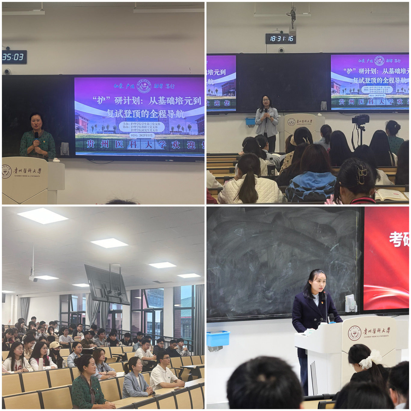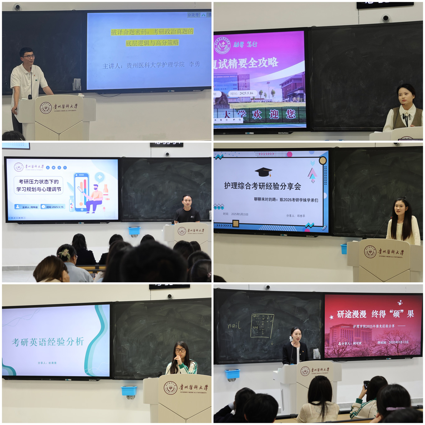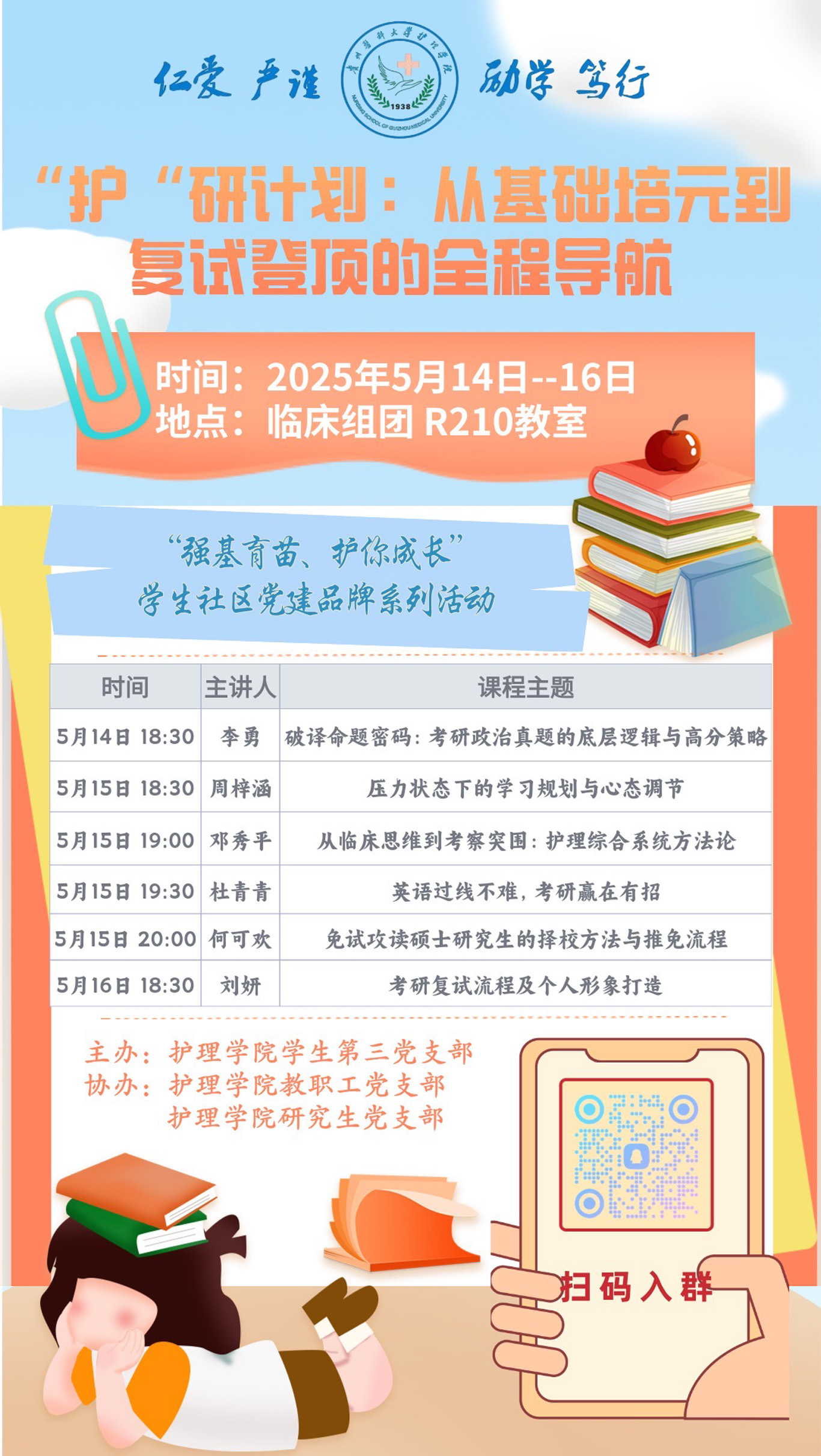 5月14日至16日,为了进一步提升人才培养质量,YABO鸭脖学生第三党支部联合教职工党支部、研究生党支部,在临床组团R210教室开展了题为“护研计划:从基础培元到复试登顶的全程导航”的考研专题系列培训,为学院学生提供全方位的考研指导。学院副处级组织员张黎、教职工党支部书记张仁莉、研究生党支部书记殷艳、辅导员李茂盛、李勇参加了活动,培训由学生第三党支部书记刘妍主持。