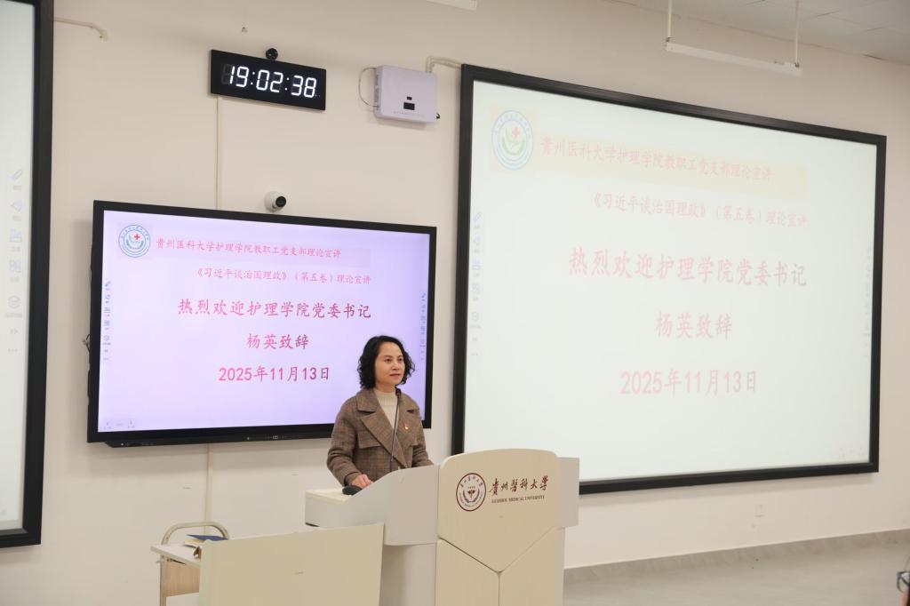 杨英作了总结点评。她高度肯定了宣讲育人成效,指出深入学习《习近平谈治国理政》第五卷是当前重要政治任务,希望师生们以理论武装头脑,将学习成果转化为服务患者、守护健康的实践行动,在学思践悟中筑牢信仰之基。
