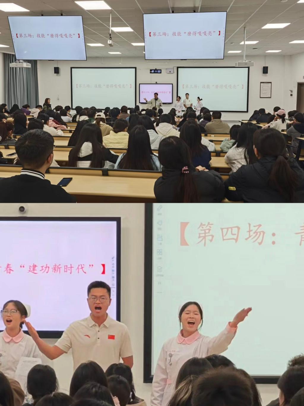 首场宣讲创新采用“师生合作、情景交融”模式,由李勇与护理学2024级1班学生马林飞、蒋福凤、杜思荣共同呈现。围绕“理论唠进心坎里”“实践练出真本事”“技能磨得精湛过硬”“青春建功新时代”四个篇章,通过案例解析、情景模拟等互动形式,将“人民至上”“高质量发展”等理论精髓与护理工作深度结合。内容涵盖“责任制整体护理”专业解读、临床一线“把小事当大事办”实践感悟及“专业技术硬杠杠、人文素养暖洋洋、职业认同亮堂堂”成长目标,让在场师生深刻体会到党的创新理论对护理工作的现实指导意义。