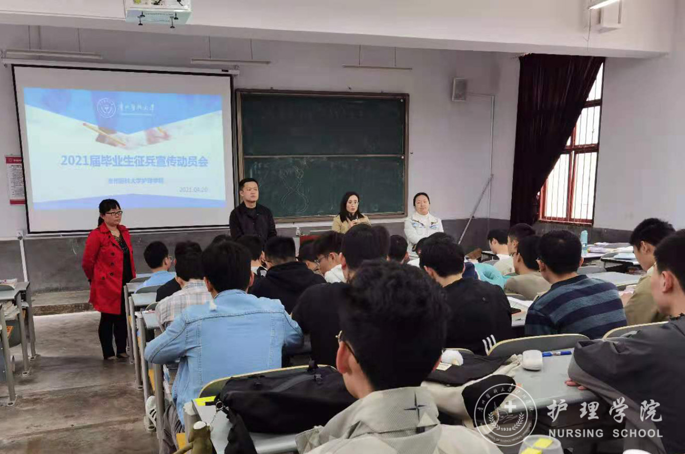 4月20日,为贯彻落实全省和学校大学生征兵工作会议精神,扎实推进大学生应征入伍工作,YABO鸭脖在北校区普教八教室召开了2021届毕业生征兵动员会。YABO鸭脖党委副书记何为、团委副书记王晓玲、学生第一党支部书记杨叶卿、学生第二党支部书记李杏春以及全体2021届毕业班男生参会,动员会由学生科副科长毕丽主持。