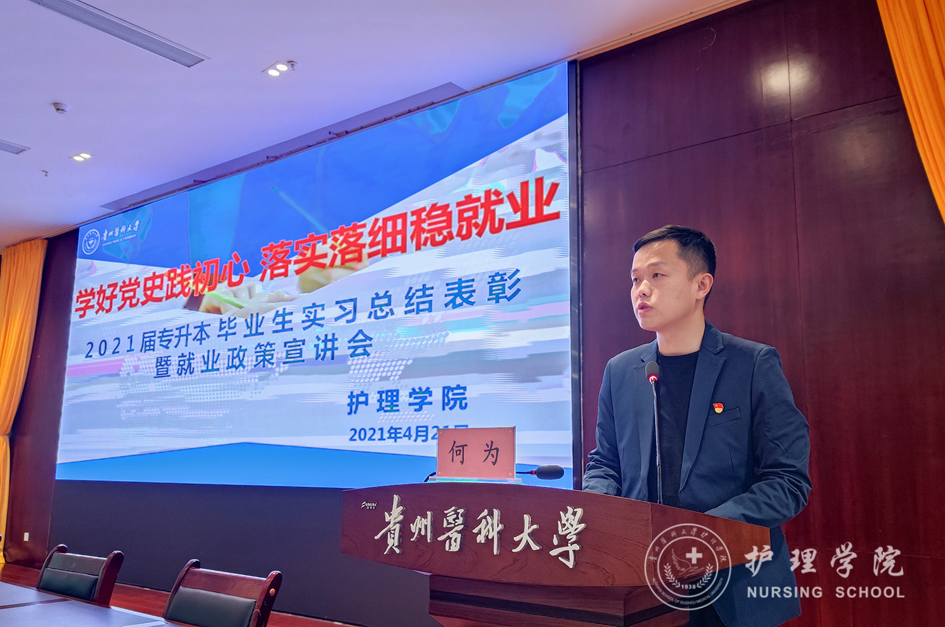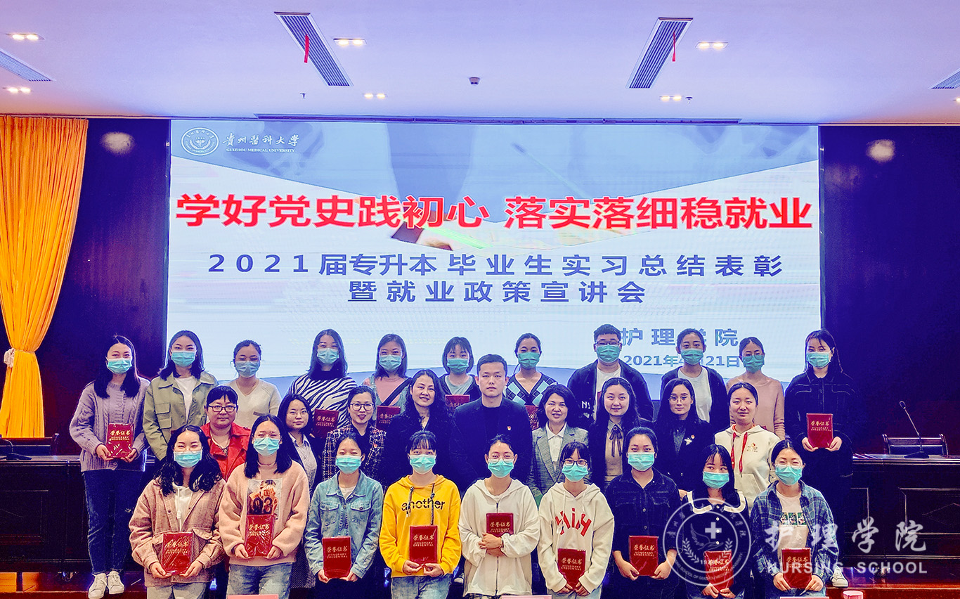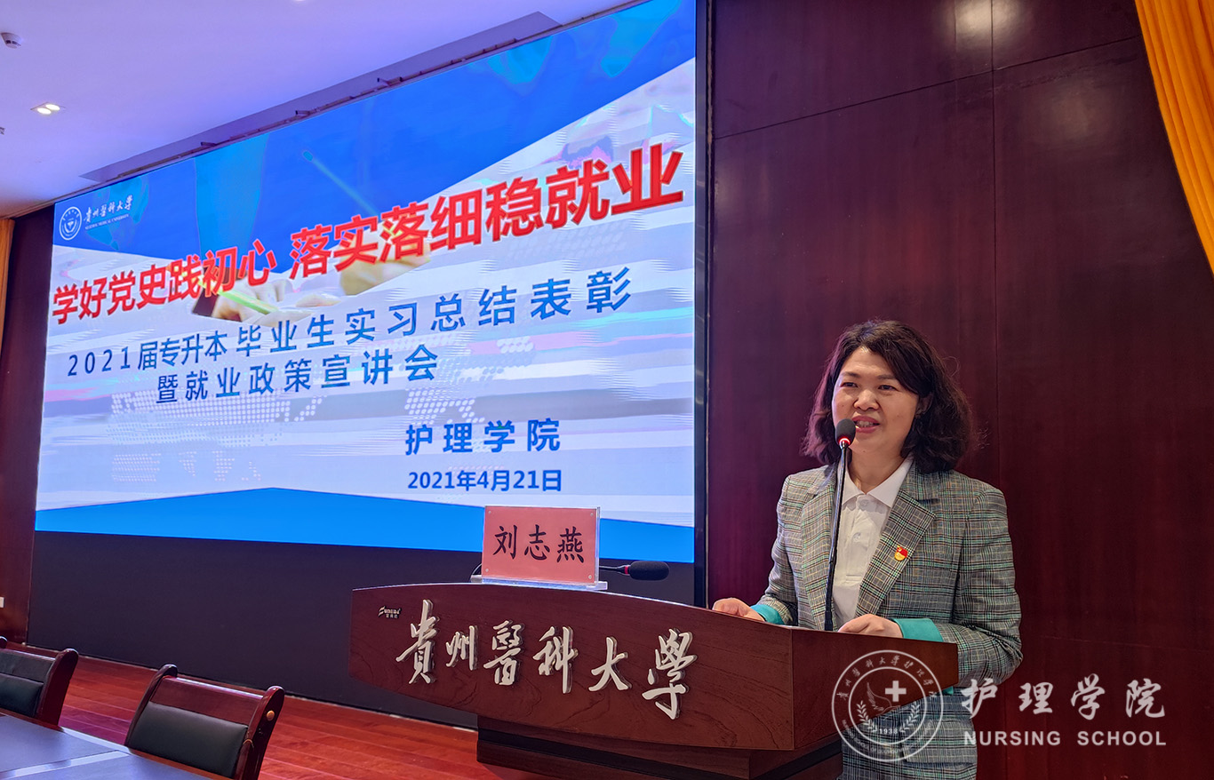 4月21日,为认真贯彻落实习近平总书记重要指示、批示精神,按照党中央、国务院决策部署,谋划和做好新发展阶段的就业工作,不断强化就业优先政策,努力实现更加充分更高质量就业,YABO鸭脖在南校区道德讲堂开展“好党史践初心 落实落细稳就业”--2021届专升本毕业生实习总结表彰暨就业政策宣讲会。YABO鸭脖党委副书记何为,党委委员、副院长刘志燕,正科级组织员曾敏,生产实习科科长柳忠燕,团委副书记王晓玲,学生党支部书记杨叶卿、李杏春、刘妍以及全体2021届专升本毕业生参会,会议由学生科副科长毕丽主持。