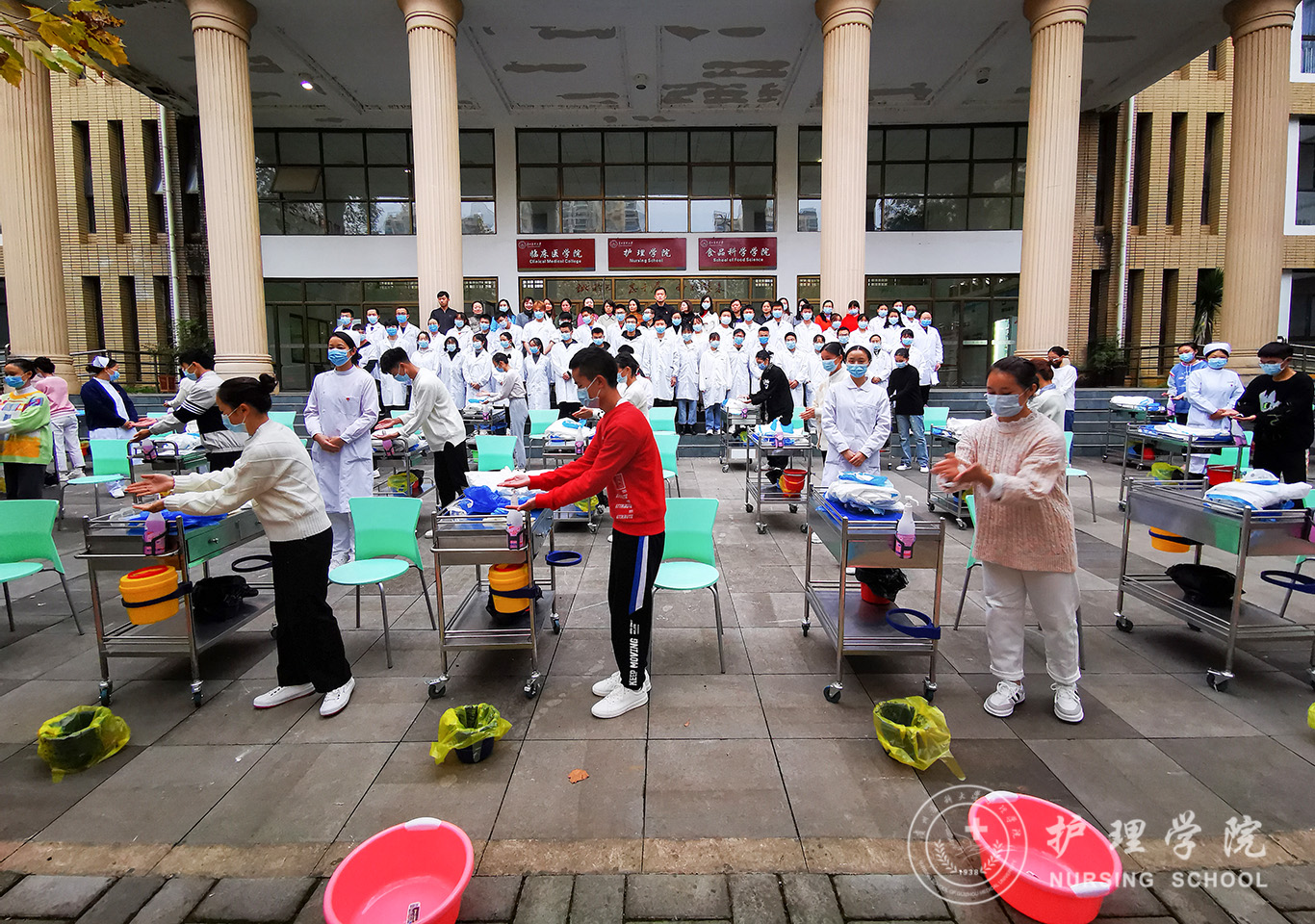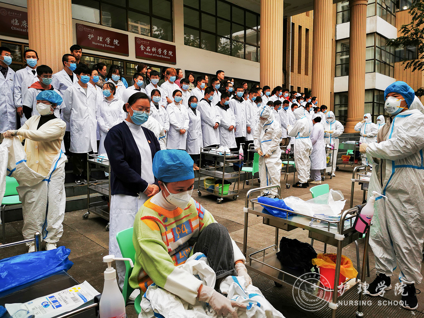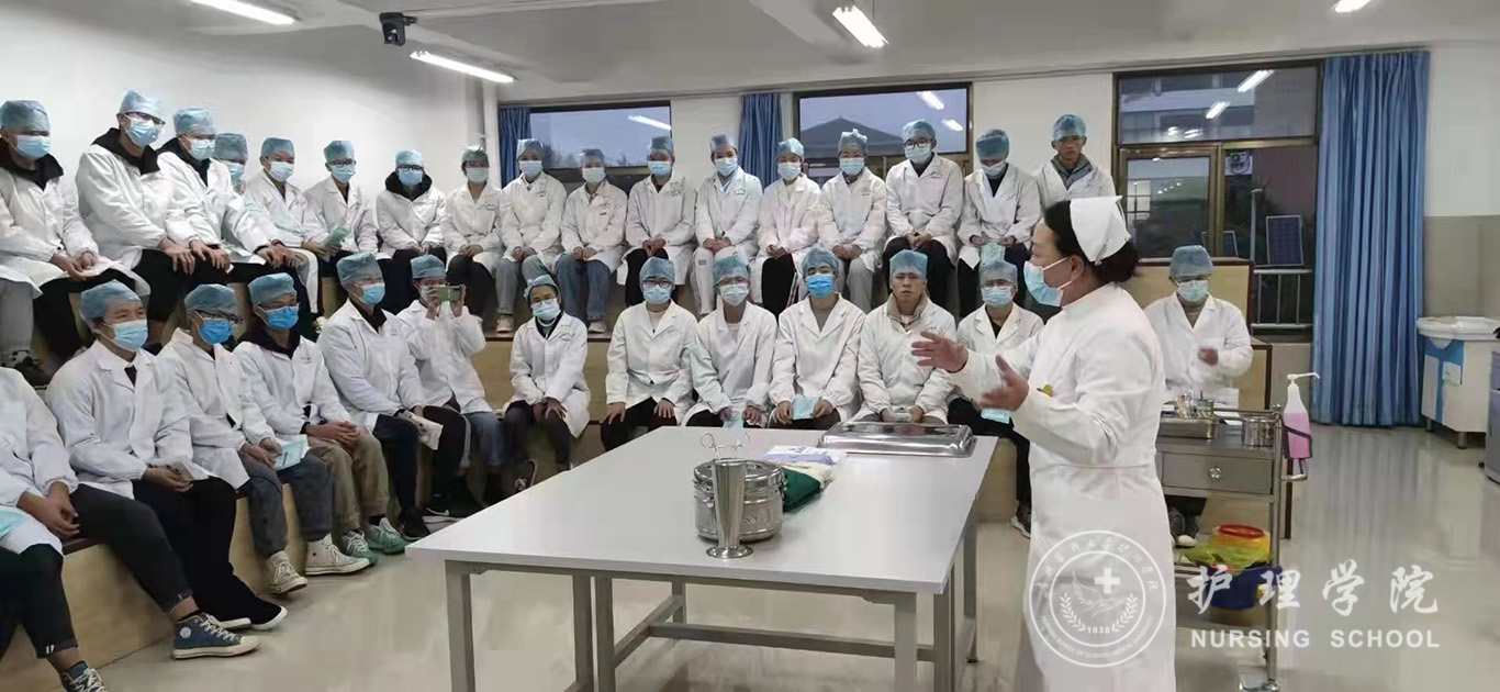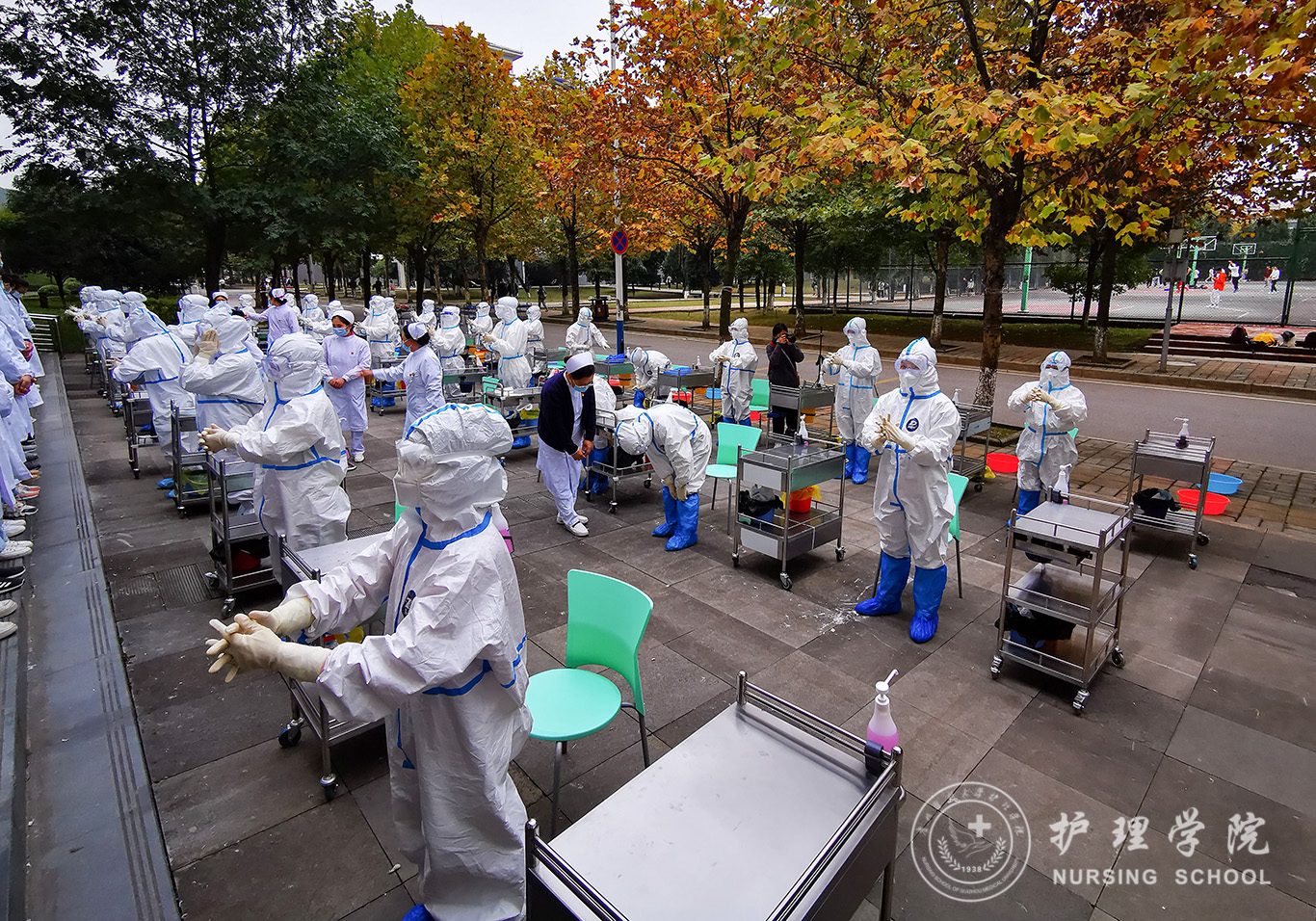 百川楼1楼小操场上,整齐摆放着30台治疗车,学生教练员早已准备就绪,随着老师一声令下,学生教练员开始现场演示如何正确穿脱防护服,他们个个认真、细心、严谨,展示了娴熟的操作技能。穿脱防护服演示结束后,鸭脖基础护理学教研室的资深教师、学生最喜爱的肖霓老师,在百川楼三楼YABO鸭脖示教室为协和班的同学进行了一场无菌操作示教活动,本次示教活动采取理论和实践相结合,生动形象的将无菌操作技术展现在同学们眼前,同学们均表示收获满满。最后,在获得防疫相关理论知识的基础上,YABO鸭脖的30名学生教练员在模拟实验室开始对协和班的同学就如何正确穿脱防护服和采取咽拭子进行“一对一”指导和考核。
