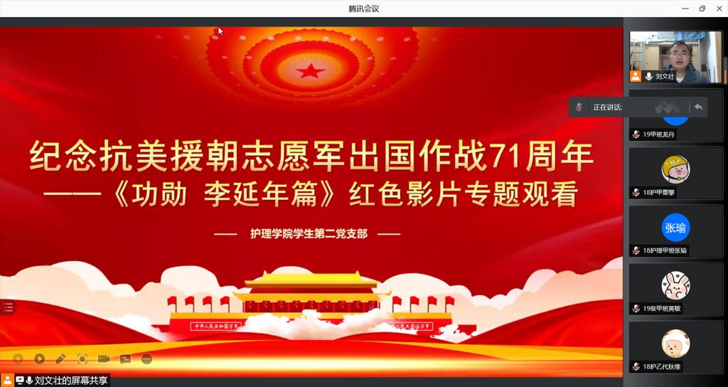 10月30日,为深入学习贯彻习近平总书记“七一”重要讲话精神,纪念抗美援朝志愿军出国作战71周年,YABO鸭脖学生第二党支部在腾讯会议组织观看《功勋 李延年篇》专题红色影片。活动由YABO鸭脖学生第二党支部书记刘文壮主持,YABO鸭脖学生第二党支部全体党员参加。